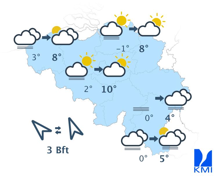 Deze namiddag is het op de meeste plaatsen zonnig. In Belgisch Lotharingen, de oostelijke Ardennen en lokaal ook in de Kempen kan de lage bewolking hardnekkig blijven. In het uiterste westen van het land kunnen wolkenvelden dan weer voor een spatje regen zorgen. Het is opnieuw vrij zacht met maxima van 7 of 8 graden in de Oostkantons en 12 à 13 graden in het centrum. De wind is overwegend zwak tot lokaal matig uit oost tot zuidoost.