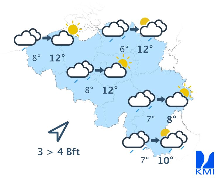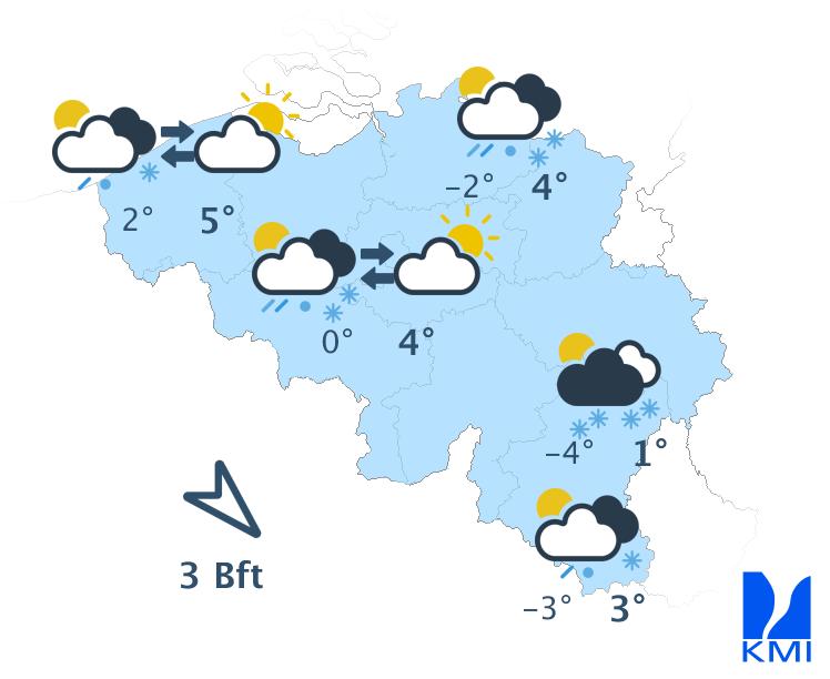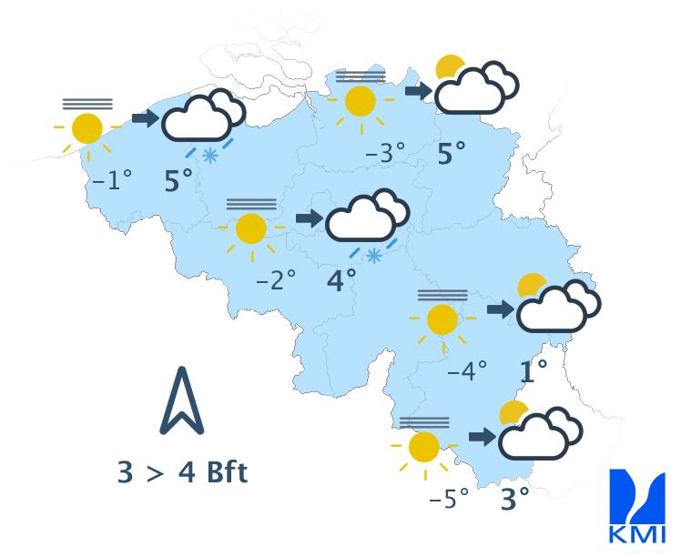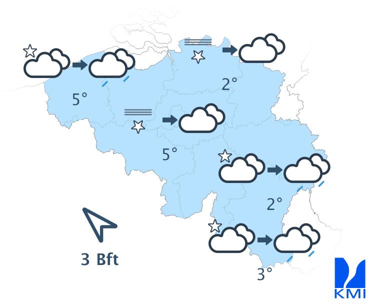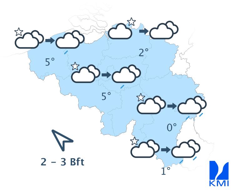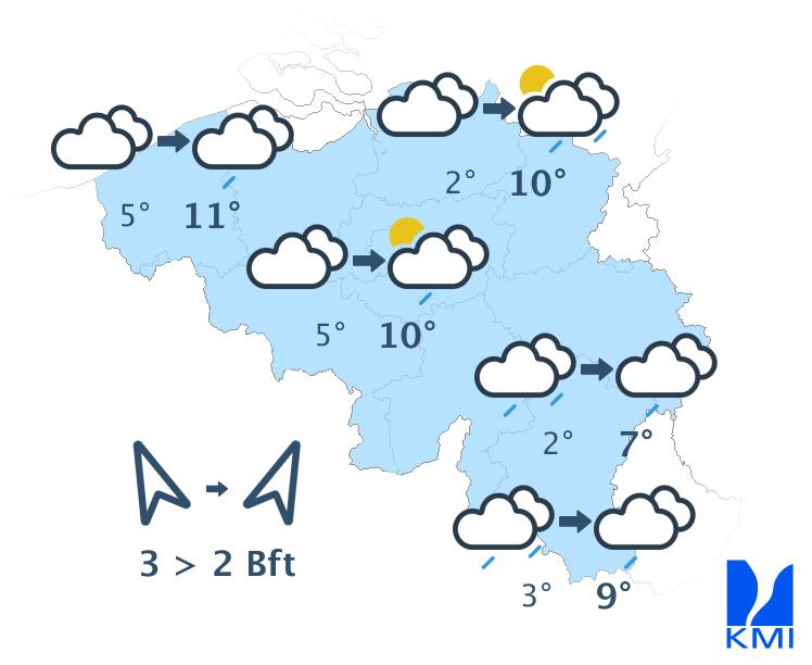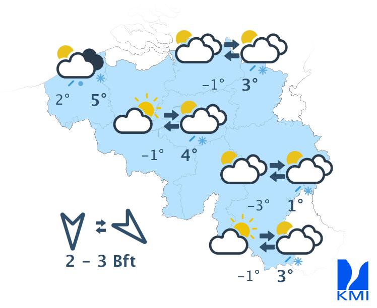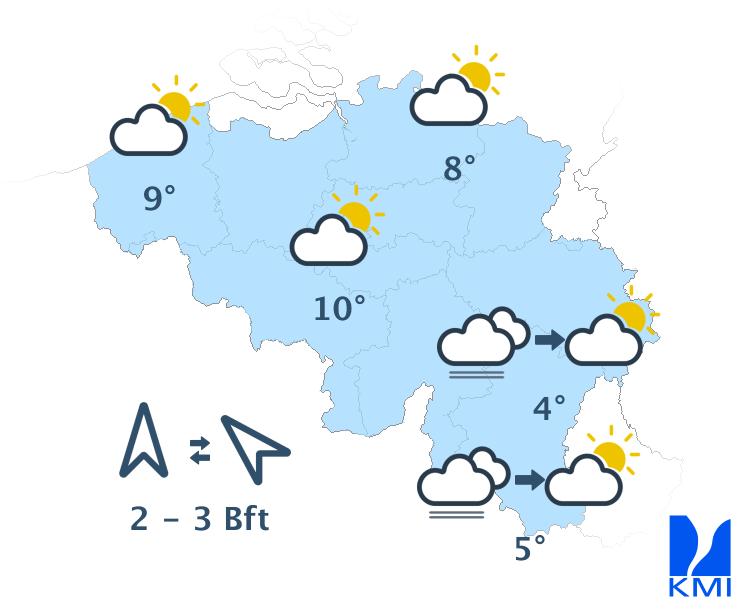 Vandaag wordt het gedeeltelijk bewolkt en droog. Langs de zuidoostelijke flank van de Ardennen kunnen lage wolken en mistbanken hardnekkiger zijn. Het blijft droog met maxima van 4 graden in de Oostkantons tot plaatselijk 10 graden in Laag- en Midden-België. De wind is zwak tot matig uit zuid tot zuidoost.