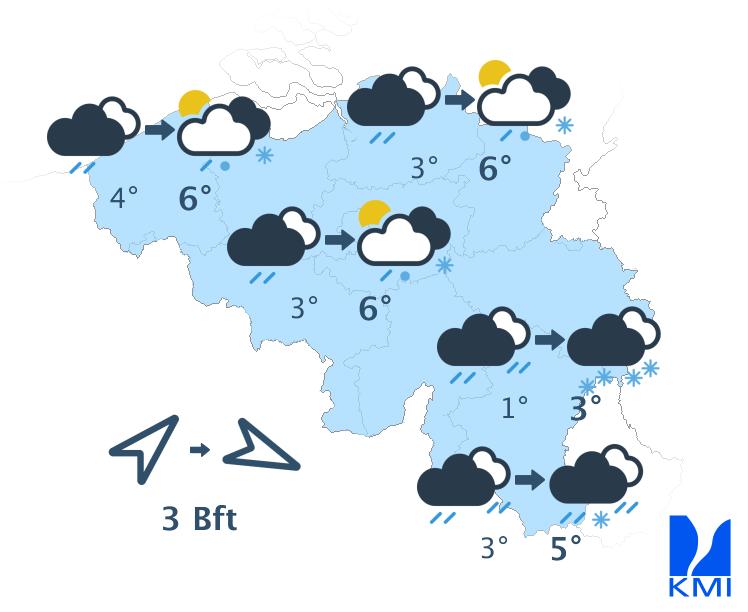 Vrijdag wordt het wisselend tot zwaarbewolkt met soms buien die in de Ardennen geleidelijk winters worden. De maxima schommelen tussen 2 en 7 graden. De zwakke tot matige westenwind ruimt stilaan naar het noordwesten. Vrijdagnacht kunnen er overal winterse buien voorkomen.