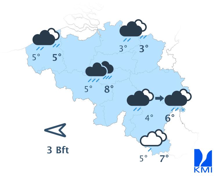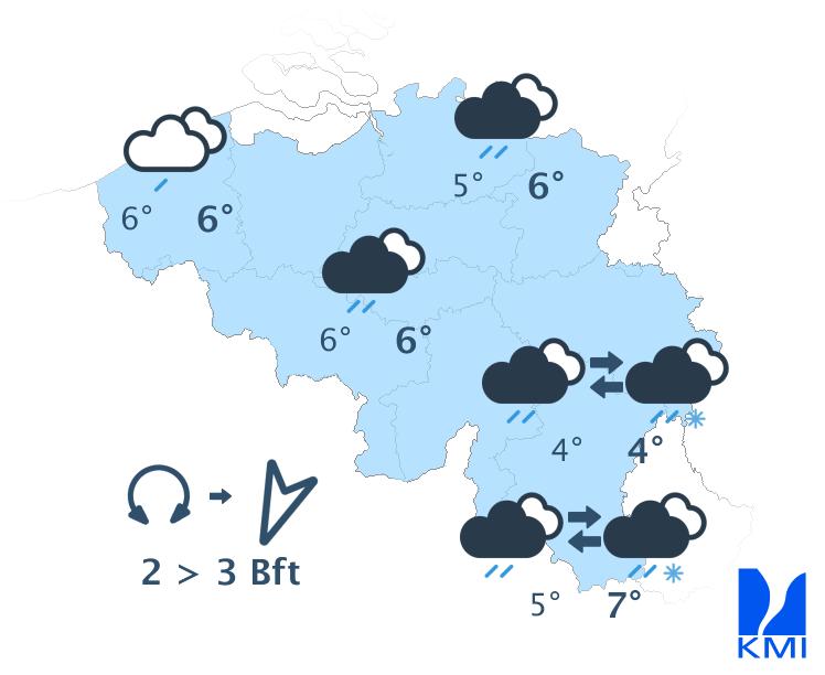 Vanavond en vannacht neemt de bewolking toe. Tijdens het tweede deel van de nacht gaat het regenen vanaf het westen en het zuidwesten. De minima liggen tussen -1 graad in de Hoge Venen en +5 graden aan de kust. De wind wordt matig uit zuidoost.