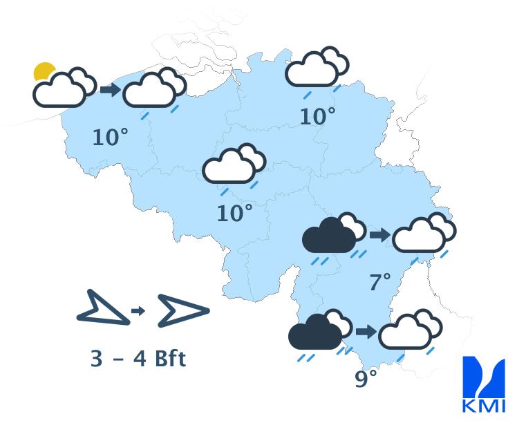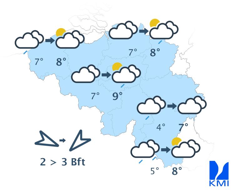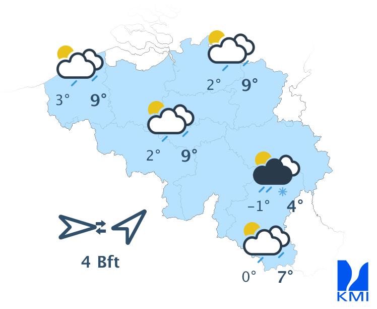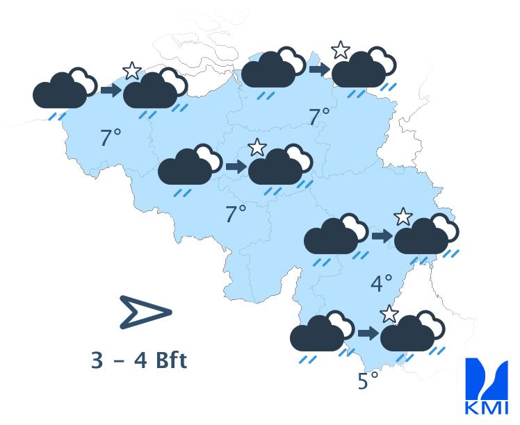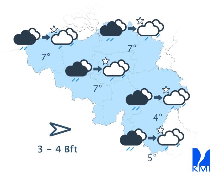 Deze namiddag is het gedeeltelijk tot vaak nog zwaarbewolkt met enkele buien of perioden van regen. De maxima liggen tussen 6 graden in de Hoge Venen en plaatselijk 11 graden in Laag- en Midden-België. De wind waait overal matig uit westelijke richtingen.