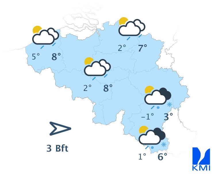 Maandag is het wisselvallig met buien die in de Ardennen nog een winters karakter kunnen aannemen. De maxima liggen tussen 2 en 8 graden.
