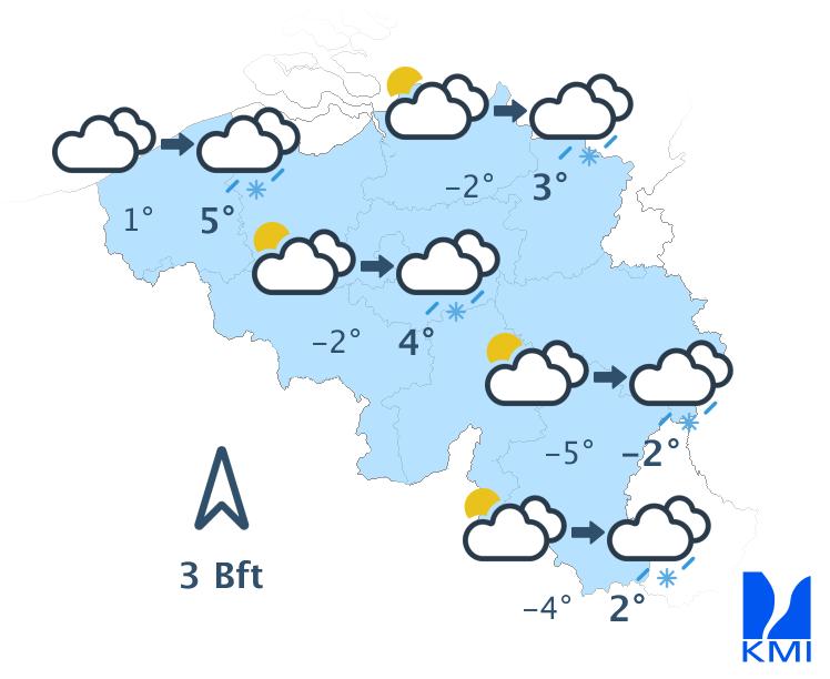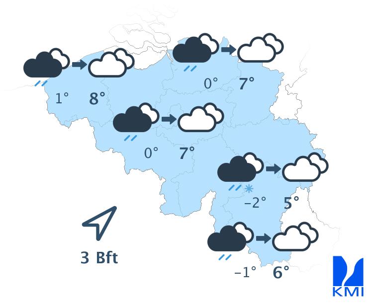 Woensdag is het veelal betrokken en valt er eerst wat regen. In de Ardennen valt er winterse neerslag. In de loop van de dag wordt het op de meeste plaatsen droog maar de zon krijgen we amper of niet te zien. Het wordt een graad of 7 in het centrum van het land.