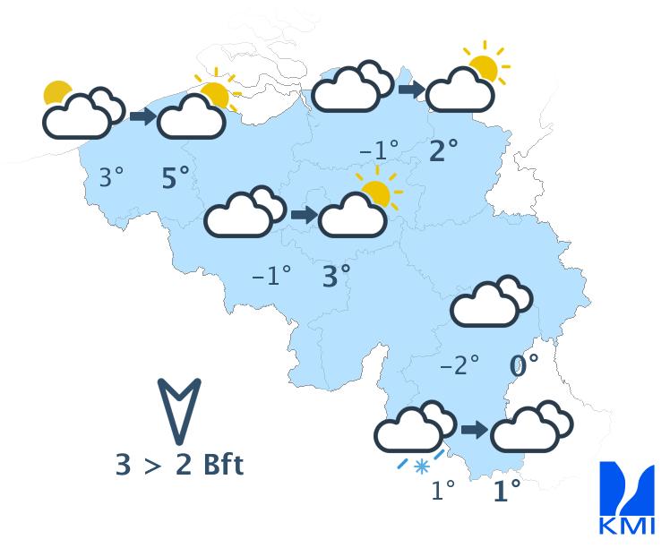 Zaterdag begint de dag in het binnenland met vriestemperaturen en kans op gladheid. Het is eerst nog zwaarbewolkt. In de loop van de dag ontwikkelen er zich opklaringen vanaf het noordwesten. In het oosten blijft het lang bewolkt. De maxima liggen tussen -1 en +3 graden bij een overwegend matige en aan zee vrij krachtige noordelijke wind die het koudegevoel nog versterkt.