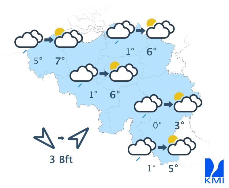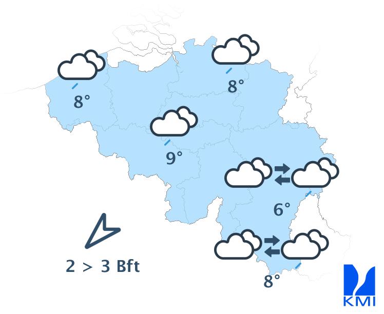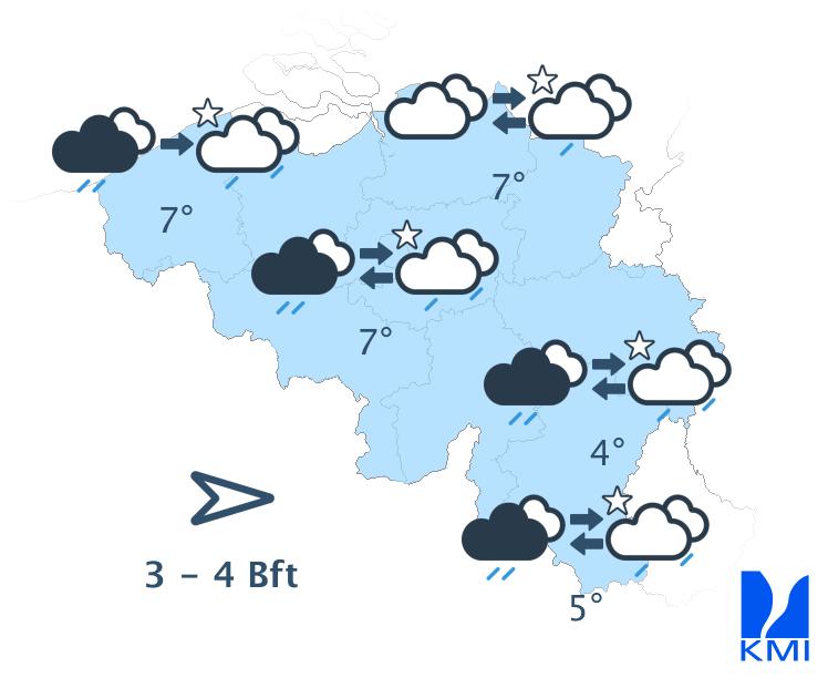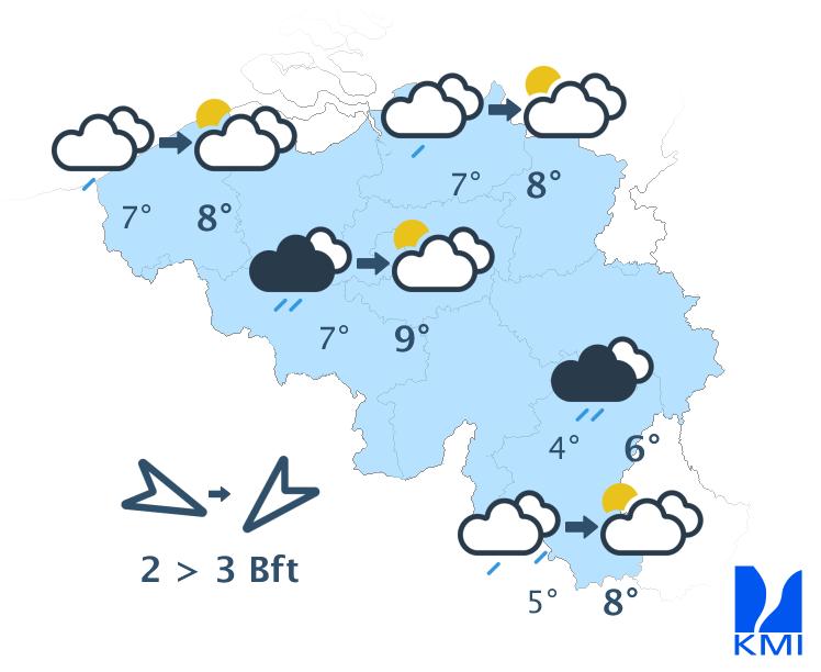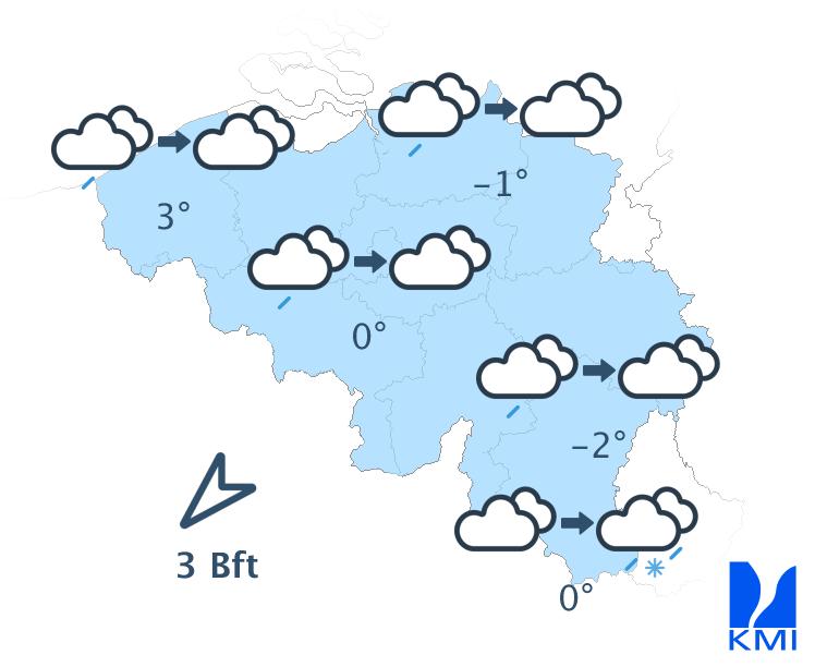 Vrijdag blijft het zwaarbewolkt met wat regen of enkele buien. De maxima liggen tussen 4 en 9 graden. De wind waait matig uit het zuidwesten in het zuiden van het land en zwak tot matig uit het noordoosten in het noorden van het land. In de namiddag wordt de wind matig in het noorden en vrij krachtig aan zee. In het zuiden van het land waait de wind dan zwak uit veranderlijke richtingen.