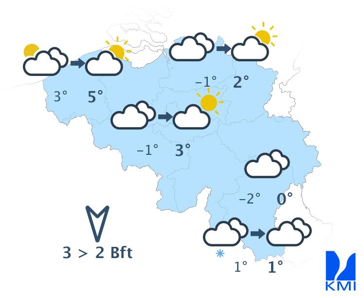 Zaterdag begint in het binnenland met lichte vorst en kans op gladheid. Het is aanvankelijk zwaarbewolkt, maar geleidelijk vormen er zich opklaringen vanaf het noordwesten. In de namiddag wordt het vrij zonnig. In het oosten blijven de wolkenvelden langer hangen. De maxima liggen tussen -3 graden in de Hoge Venen en +4 graden aan zee. De wind waait meestal matig of aan zee vrij krachtig uit het noorden en verscherpt het koudegevoel.