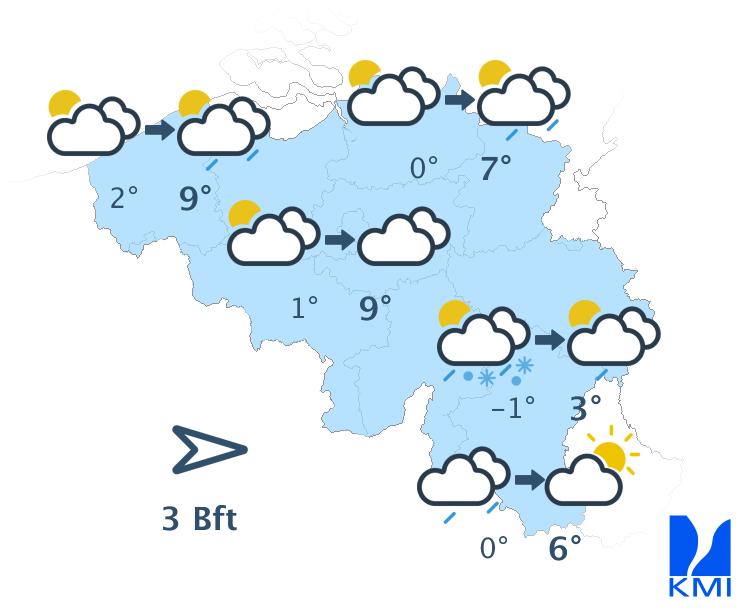 Dinsdagochtend is het eerst zwaarbewolkt met veel lage wolken. Nadien wordt het wisselend bewolkt en trekt er een buienlijn van west naar oost over ons land met soms een winters karakter (regen, smeltende sneeuw of korrelhagel). Op de Hoge Venen kan er zelfs wat sneeuw blijven liggen. In de namiddag verschijnen er overal bredere opklaringen maar het blijft onstabiel in het westen met buien. de temperaturen schommelen tussen 0 graden in de Oostkantons en 5 of 6 graden in Vlaanderen. De wind is matig en vrij krachtig aan zee uit west, ruimend naar westnoordwest met rukwinden tot 50 km/h.