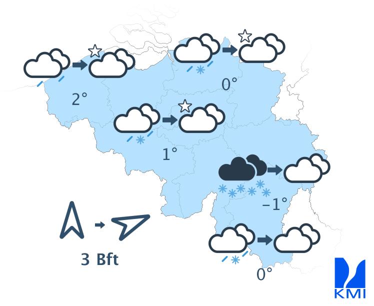 Vannacht stroomt er geleidelijk zachtere lucht over ons land vanuit het westen. De sneeuw gaat over in regen en nadien wordt het droger maar enkele buien blijven mogelijk. De minima worden in het begin van de nacht genoteerd en schommelen tussen -1 en +2 graden van oost tot west. Nadien worden de temperaturen positief op de meeste plaatsen. De wind draait naar west tot zuidwest en is matig in het binnenland en soms vrij krachtig aan zee met rukwinden tot 60 km/h.