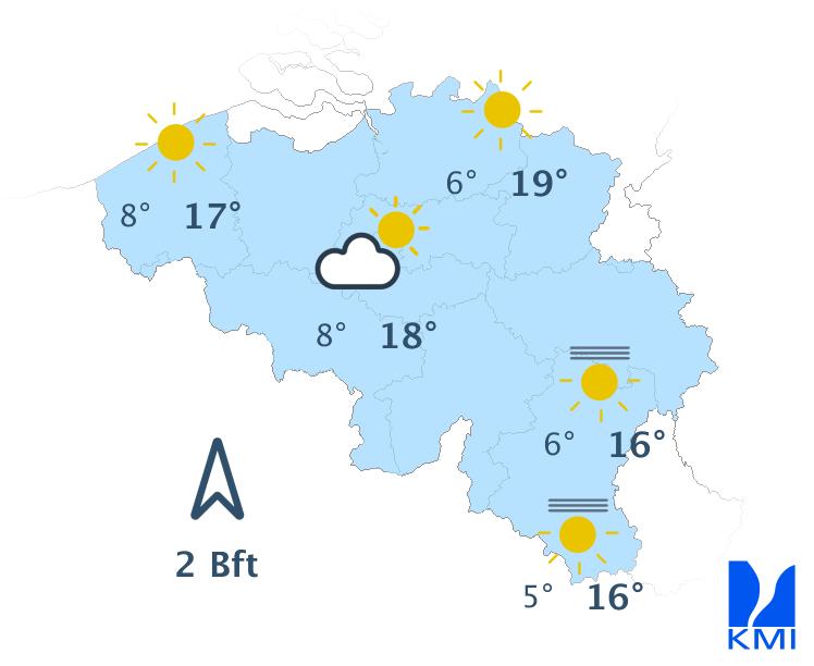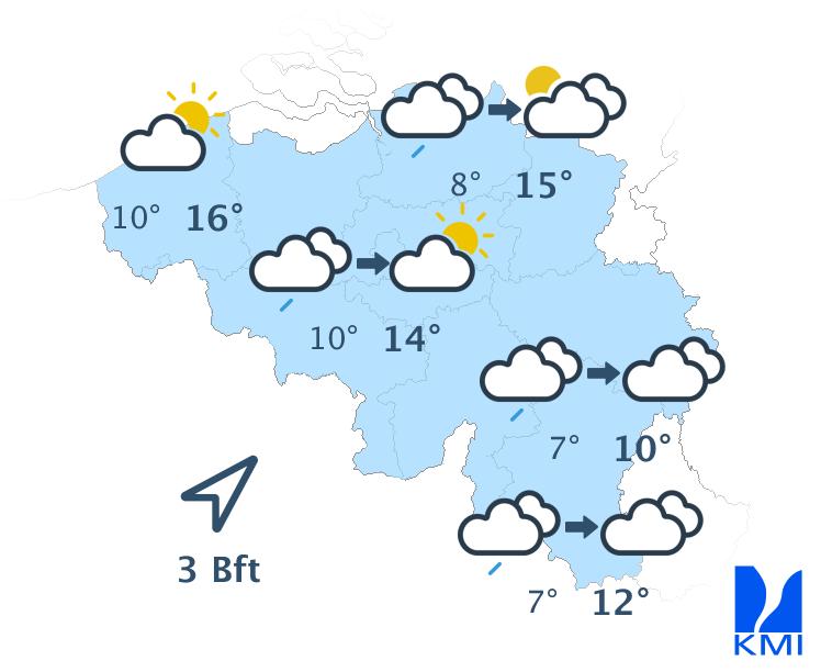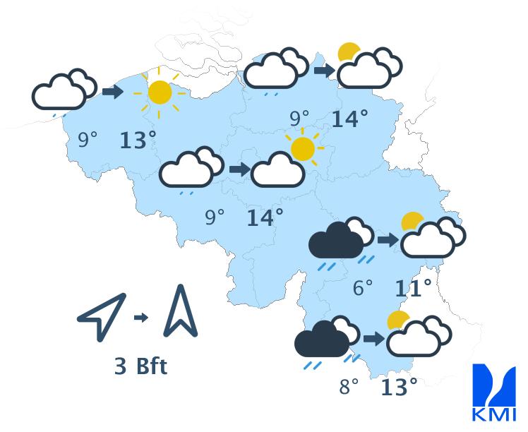 Dinsdag start met veel bewolking, met in het centrum en het oosten wellicht nog wat lichte neerslag. In de loop van de dag breekt de bewolking meer en meer open en krijgen we stilaan meer zon. Tegen de avond klaart het zo goed als uit. De wind is overwegend matig en draait van zuidwest naar zuid. De temperaturen klimmen tussen 10 à 11 graden in de Hoge Ardennen en 14 of 15 graden op de meeste plaatsen in Vlaanderen.