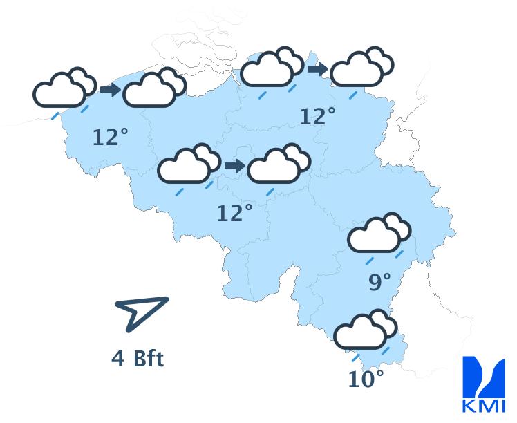 Vanavond trekt de regenzone verder over het oosten van het land en verlaat ons land in de loop van de nacht. Daarachter wordt het overwegend droog met enkele opklaringen maar doorgaans nog veel bewolking. Ten zuiden van Samber en Maas is het zicht vaak beperkt. De minima liggen tussen 5 graden in de Hoge Ardennen en 9 graden in Vlaanderen. De wind blijft matig een aan zee eerder vrij krachtig uit westzuidwest.