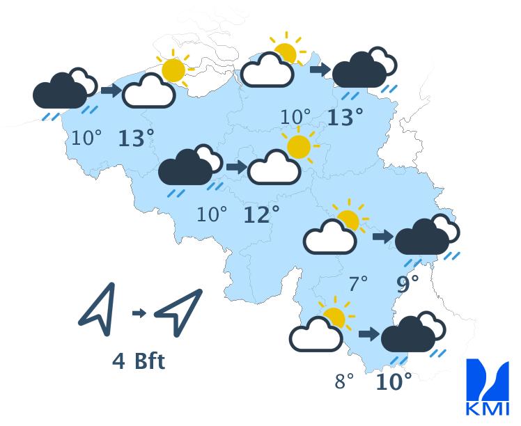 Vandaag is het zwaarbewolkt met regen die van west naar oost door het land trekt. Tegen de avond wordt het in het noordwesten droog maar opklaringen blijven nog uit. De maxima liggen tussen 8 graden in de Hoge Ardennen en 11 à 12 graden in Vlaanderen. De wind is matig en aan zee vrij krachtig tot soms krachtig uit westzuidwest. De rukwinden kunnen oplopen tussen 50 à 60 km/h.