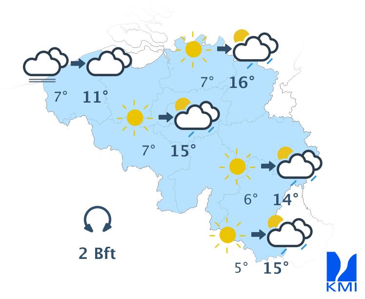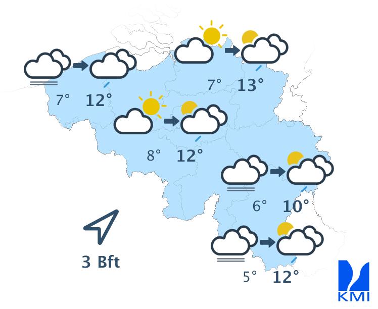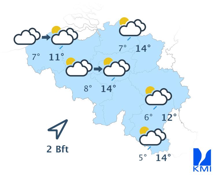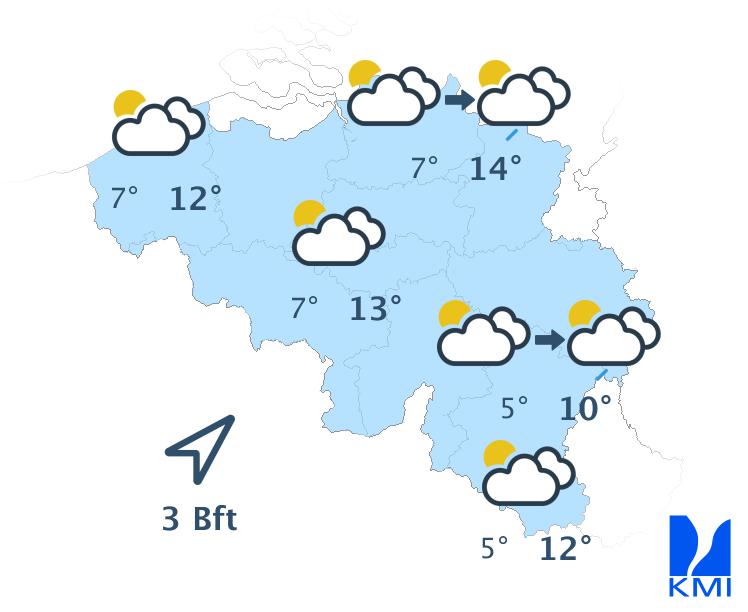 Dinsdag start grijs in het noordwesten van het land. Elders is het zonnig. In de loop van de dag wordt het halfbewolkt met kans op een geïsoleerde bui. Het wordt iets minder zacht met maxima rond 13 of 14 graden in de meeste streken. De wind waait zwak uit veranderlijke of zuidwestelijke richtingen.