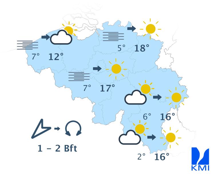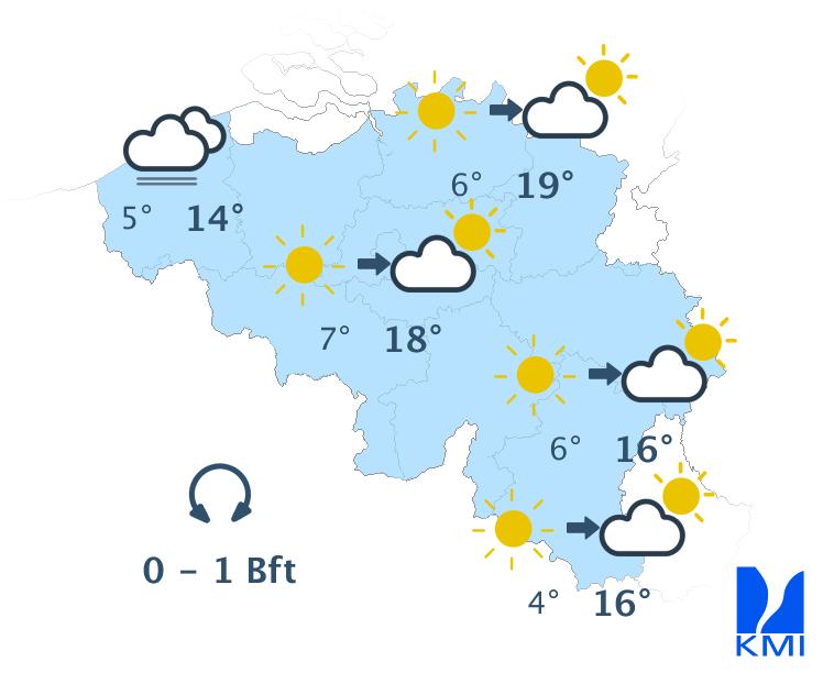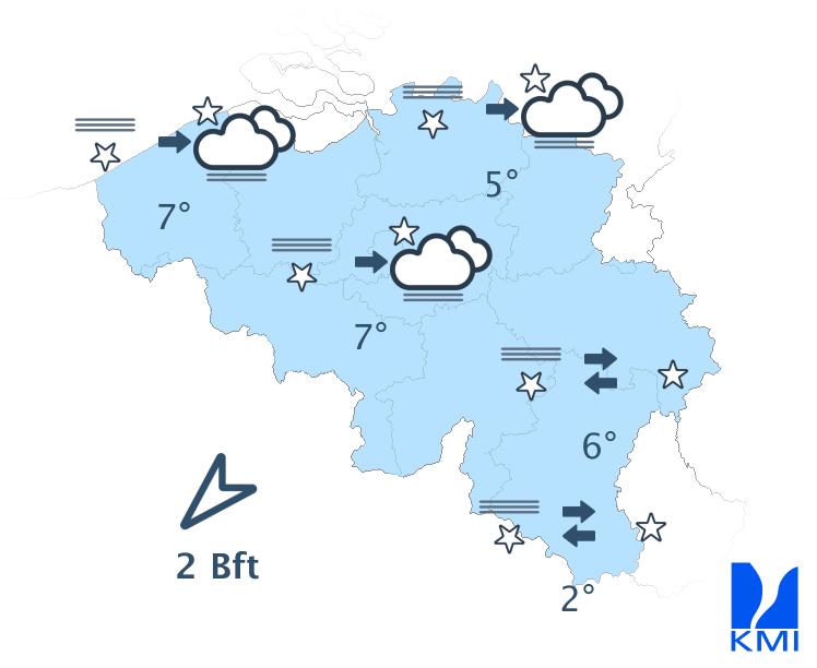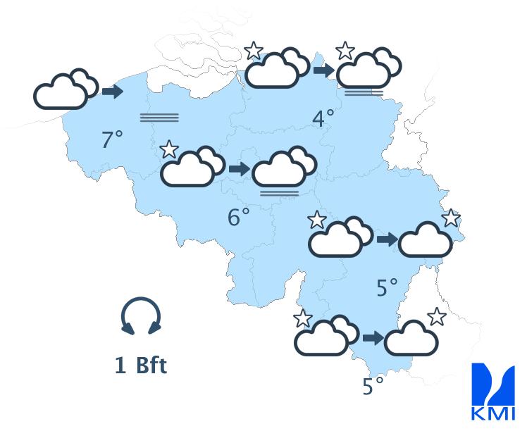 Aan het begin van de nacht hangt er vrij veel middelhoge en hoge bewolking met kans op wat gedruppel in het westen. Na middernacht klaart de hemel uit over de zuidoostelijke landshelft, terwijl er lage bewolking komt opzetten vanaf de Noordzee met vorming van mist in het westen en het centrum. De minima liggen tussen 2 of 3 graden in de Hoge Ardennen (of zijn zelfs negatief in sommige valleien) en 4 tot 7 graden elders. De wind is zwak en variabel of komt uit het noordoosten. Aan zee wordt hij matig uit het noordoosten.