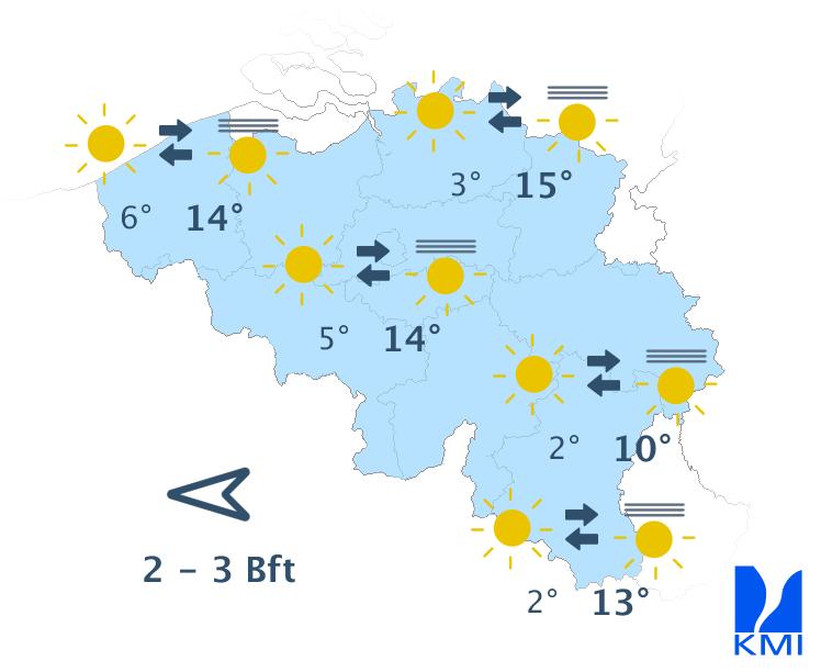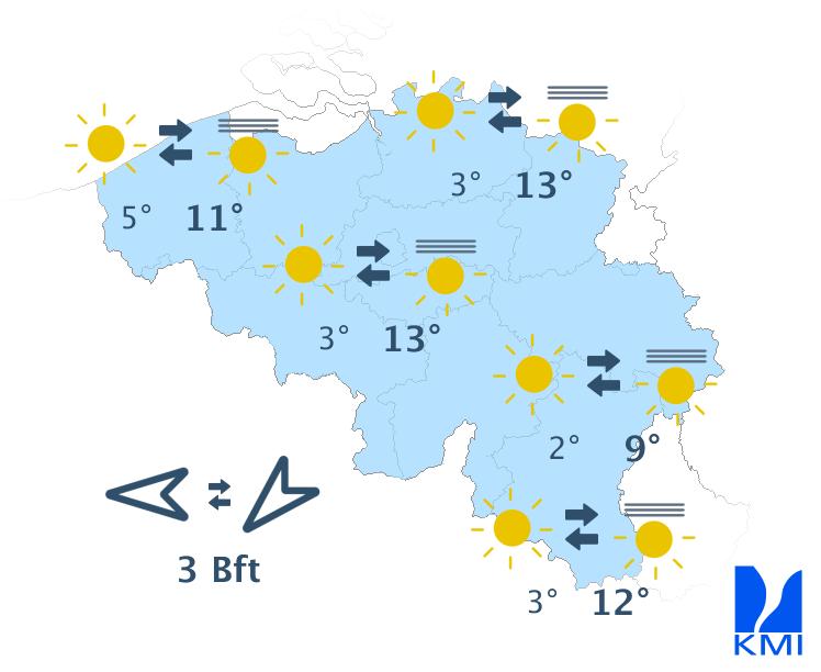 Na het snelle verdwijnen van het lokale ochtendgrijs wordt het vandaag op de meeste plaatsen vrij zonnig. In het oosten van het land is er wel meer bewolking. In de loop van de dag verschijnen er meer stapelwolken en deze namiddag schuift er vanaf het westen veel middelhoge en later ook lage bewolking over het land. De maxima liggen tussen 5 of 6 graden in de Hoge Venen en 12 graden in het westen. De zwakke wind uit zuid of zuidzuidwest wordt matig, en aan zee vrij krachtig, uit zuidzuidwest tot zuidwest. Vooral in het uiterste westen van het land is er kans op rukwinden tot rond 50 km/h.