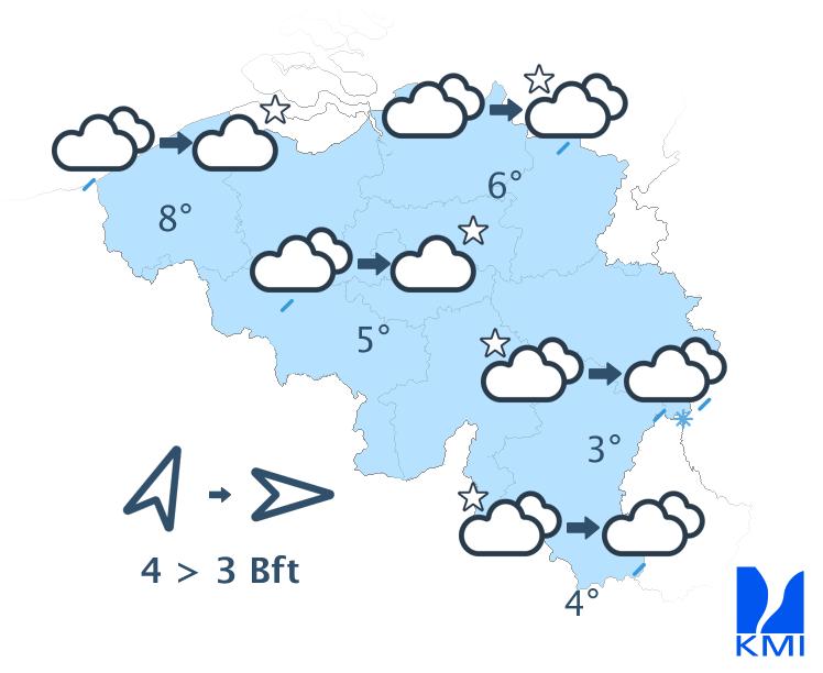 Vanavond en vannacht is het zwaarbewolkt met (lichte) regen die van west naar oost over het land trekt. Na de regen volgen nog enkele buien. In de Hoge Venen en op de Ardense toppen valt er wat smeltende sneeuw. Tijdens het tweede deel van de nacht wordt het droog met opklaringen vanaf het westen, maar pas op het einde van de nacht steken de laatste buien de grens met Duitsland en Luxemburg over. De minima liggen rond 1 graad in de Hoge Venen, rond 7 graden in het centrum en rond 8 graden aan zee. De wind waait matig tot vrij krachtig uit zuid tot zuidwest, met rukwinden tussen 50 en 60 km/h. Later ruimt hij naar west en neemt hij af tot matig.