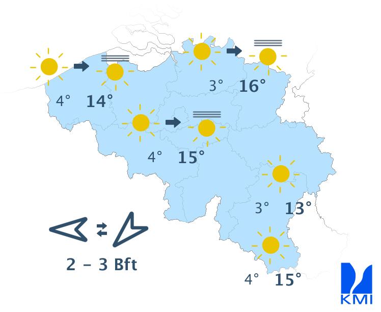 Woensdagochtend zijn er aanvankelijk wat lokale wolkenvelden mogelijk. Later is het overal zonnig. De maxima liggen tussen 10 graden op de Ardense Hoogten en 16 graden in Vlaanderen bij een matige oostelijke wind.