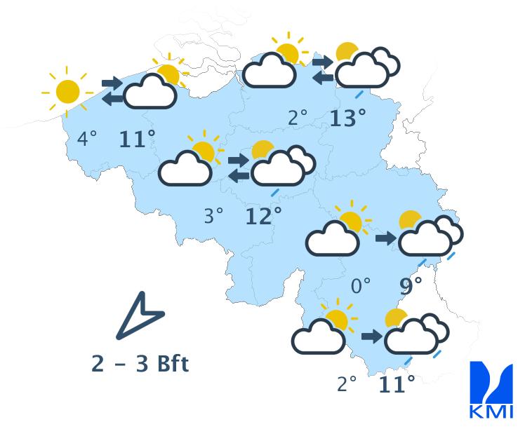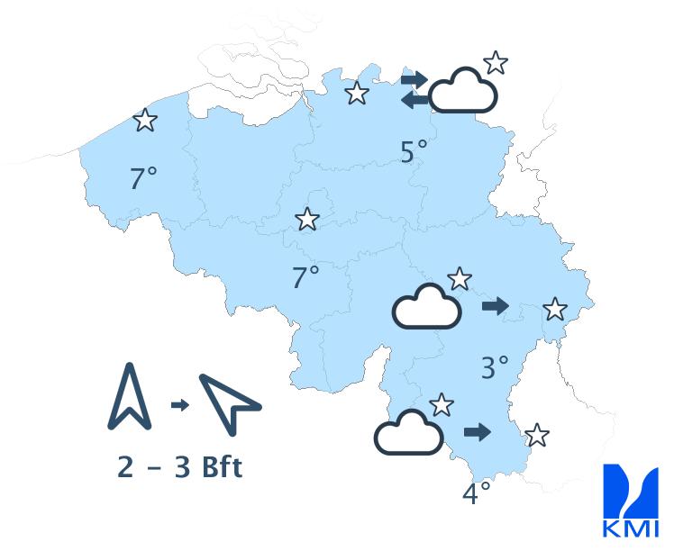 Vanavond wordt het helder tot licht bewolkt met hoge wolkensluiers. In de loop van de dag komen er mogelijk opnieuw wolkenvelden binnendrijven vanaf het oosten. De minima liggen over het algemeen tussen 1 graad in de Hoge Venen en 7 graden in de stadscentra bij een zwakke tot matige wind die draait naar zuidoost.