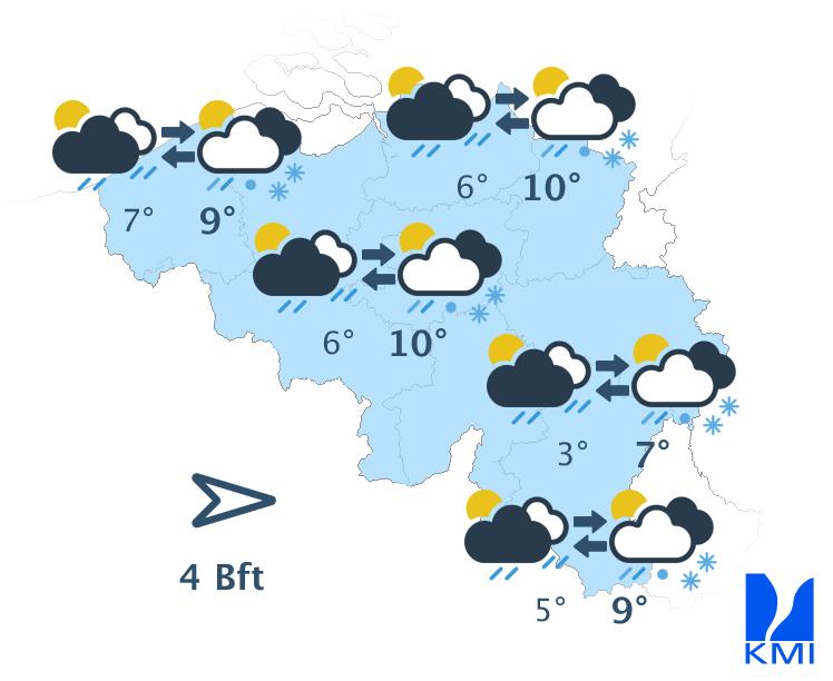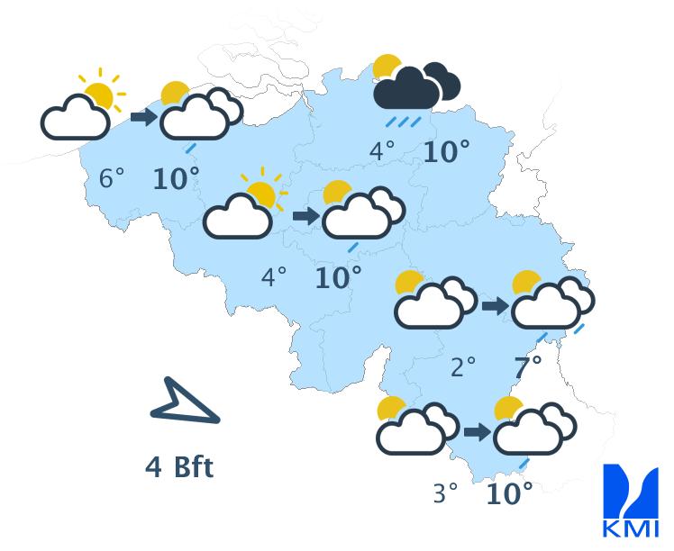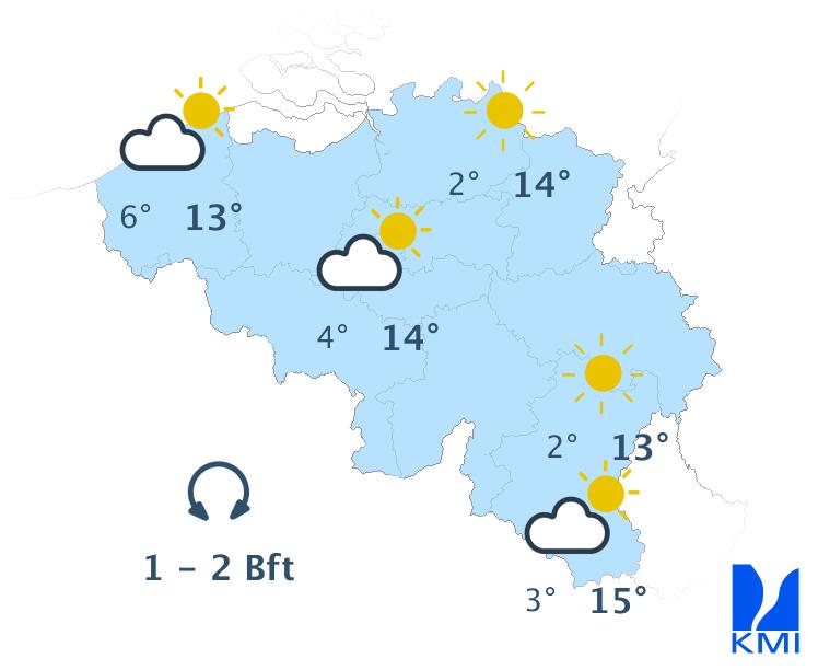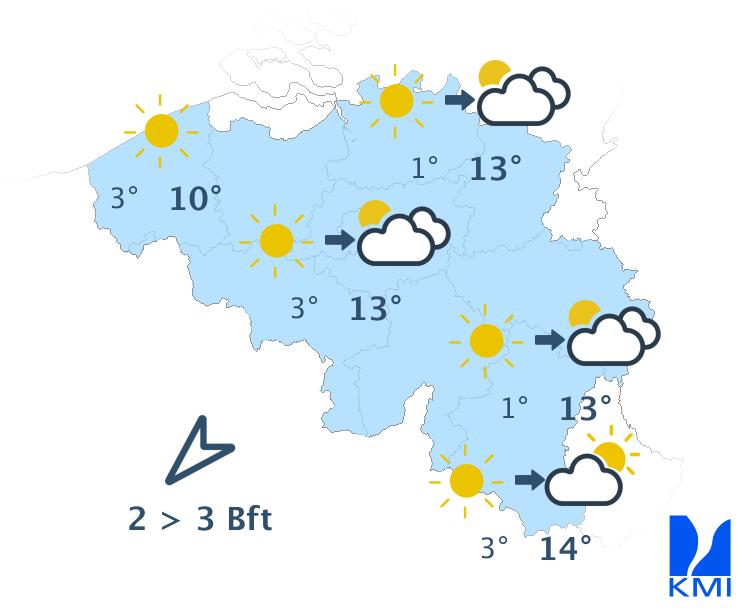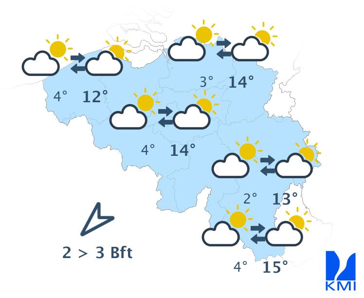 Morgen wisselen zon en soms wat meer hoge en middelhoge wolkenvelden elkaar af. Het eventuele ochtendgrijs lost snel op. In de namiddag kunnen er ook enkele stapelwolken gevormd worden. Het wordt een graadje minder zacht met maxima tussen 10 graden in de Hoge Venen en 15 graden in het centrum en in Belgisch Lotharingen. De wind wordt zwak tot matig uit noordoost. Aan zee steekt er na de middag opnieuw een matige zeebries op uit noordnoordoost.