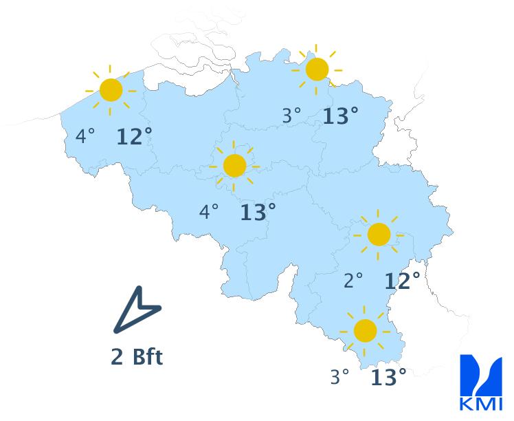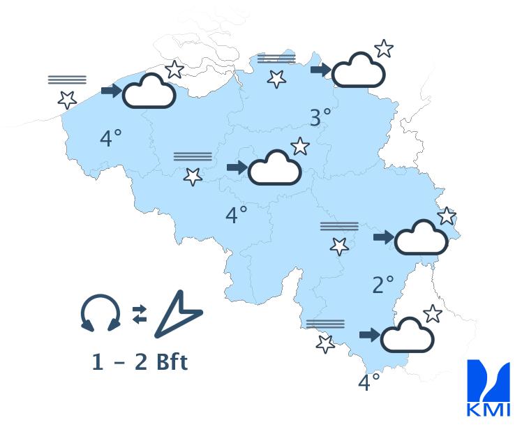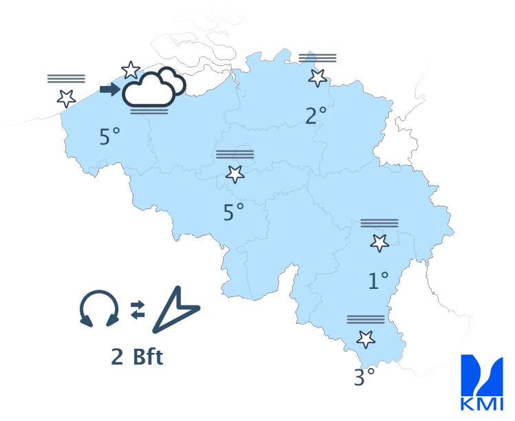 Vannacht verschijnen er meer hoge en nadien middelhoge wolkenvelden over ons land vanaf het noorden. Vooral in het westen kan er zich nevel of mist vormen. De minima liggen tussen lokaal -5 graden in sommige Ardense valleien en 5 graden in het noordwesten van het land. De wind wordt zwak uit veranderlijke of noordoostelijke richtingen.