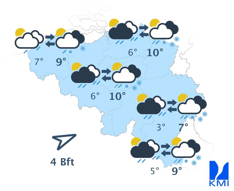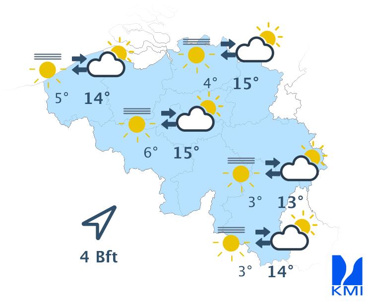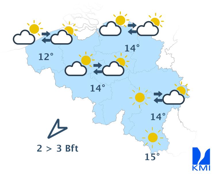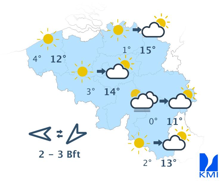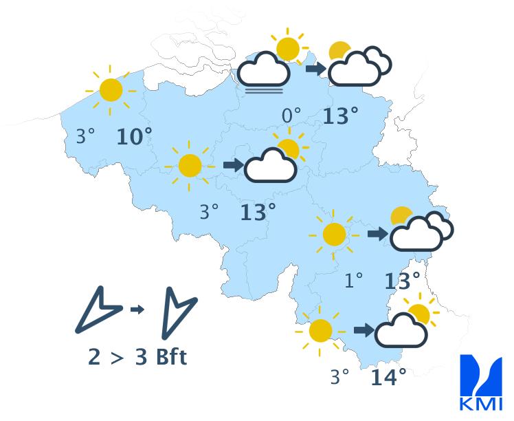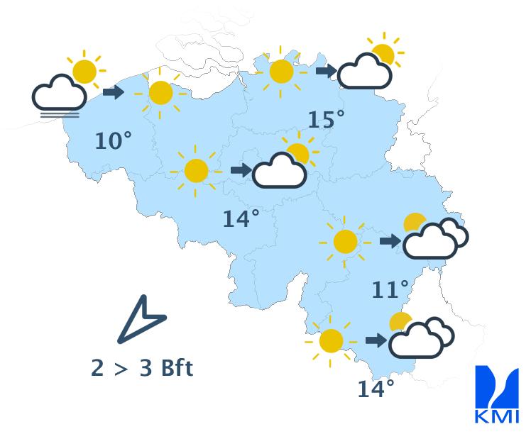 Vandaag wisselen zon en soms wat meer hoge en middelhoge wolkenvelden elkaar af. In de namiddag kunnen er ook enkele stapelwolken gevormd worden. Het wordt een graadje minder zacht met maxima tussen 10 graden in de Hoge Venen en 15 graden in het centrum en in Belgisch Lotharingen. De wind wordt zwak tot matig uit noordoost. Aan zee steekt er na de middag opnieuw een matige zeebries op uit noordnoordoost.