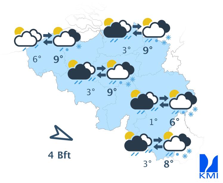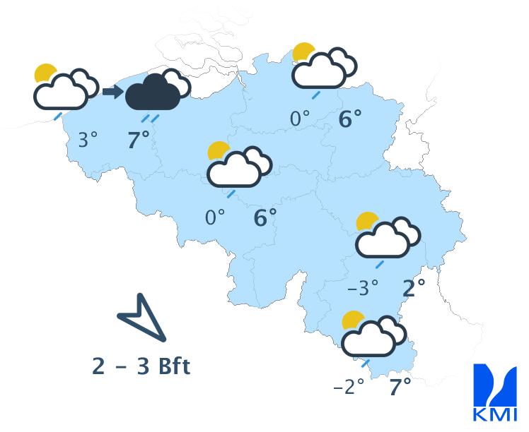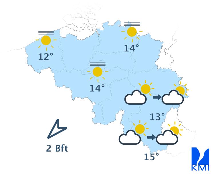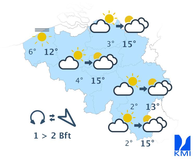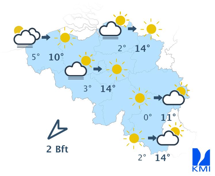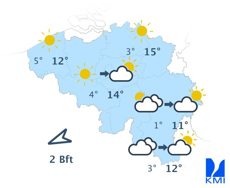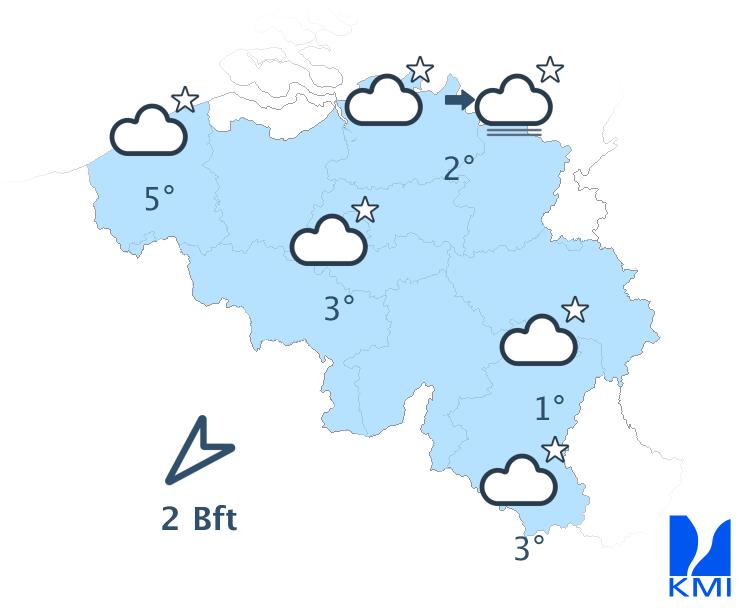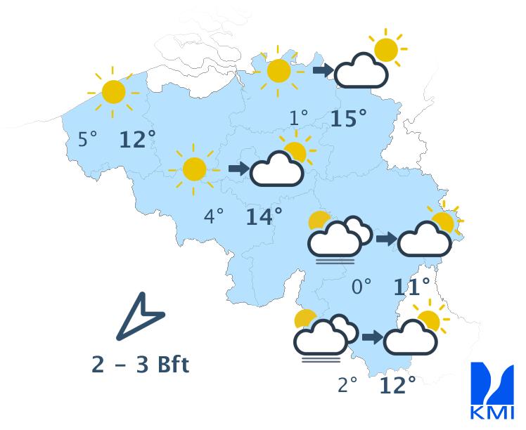 Vanavond en volgende nacht is het lichtbewolkt. Tegen het einde van de nacht is er in het noorden kans op nevel, mist of lage wolken vanuit Nederland. Het koelt goed af met minima in de meeste streken tussen 0 en 5 graden. In sommige Ardense valleien kunnen de temperaturen zakken tot -5 graden. De noordoostelijke wind wordt zwak en soms veranderlijk.