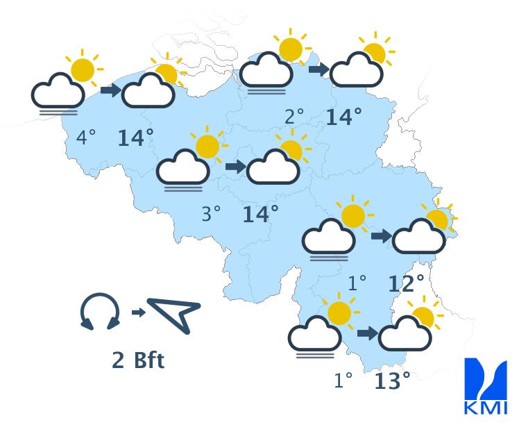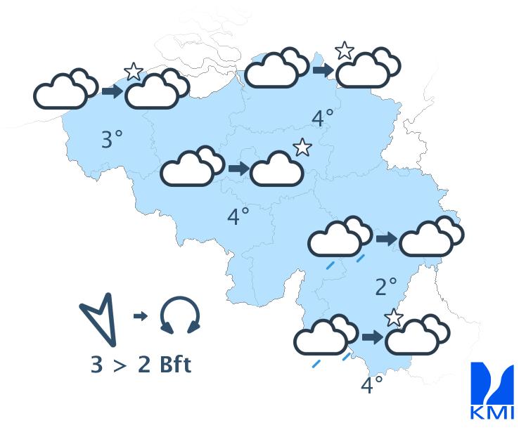 Vanavond en in het eerste deel van volgende nacht is er vooral ten zuiden van Samber en Maas nog veel bewolking met wat regen terwijl het elders al droog is met enkele opklaringen in het westen. In het tweede deel van de nacht ontwikkelen er zich op de meeste plaatsen brede opklaringen. In de Ardennen blijft het bewolkt en kan laaghangende bewolking het zicht beperken op de hoogten. De minima liggen tussen -1 en 4 graden. De wind waait zwak tot matig uit noord tot noordwest en wordt tijdelijk zwak en veranderlijk. Tegen het einde van de nacht wordt hij in het westen opnieuw zwak tot matig, maar dan uit zuid tot zuidwest.