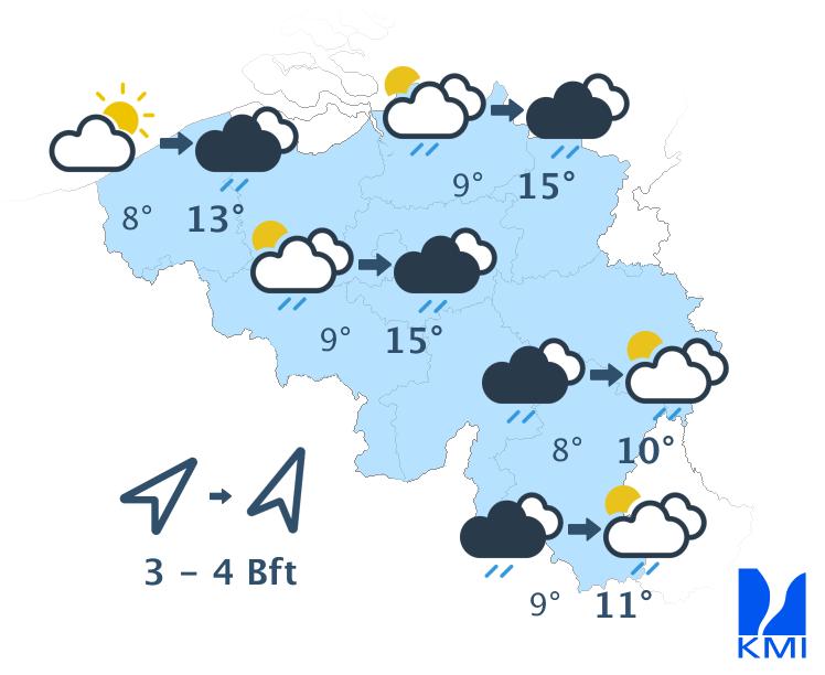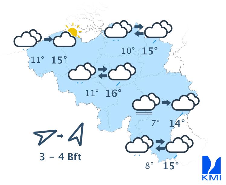 Zondag bereikt een (zwakke) regenzone al vroeg op de dag het noordwesten van het land en breidt ze zich in de loop van de voormiddag uit naar de andere regio’s. In de namiddag wordt het vanaf de kust geleidelijk wisselvalliger met soms brede opklaringen in het westen maar ook nog kans op enkele buitjes.De maxima liggen tussen 10 à 11 graden in de Hoge Venen en 13 à 14 graden in het centrum. De wind waait eerst matig tot vrij krachtig uit zuidwest, draait daarna naar westzuidwest tot westnoordwest en wordt over het algemeen matig.