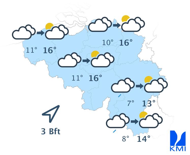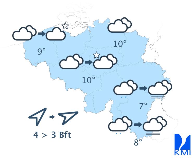Vanavond blijft de bewolking domineren met soms nog wat gedruppel. In de loop van de nacht ontwikkelen er zich opklaringen in het westen en noordwesten van het land. In de Ardennen kunnen de lage wolken zorgen voor een verminderd zicht. De minima liggen tussen 6 graden in de Hoge Venen en 9 of 10 graden in Laag- en Midden-België. De zuidwestenwind is matig in het binnenland en vrij krachtig tot krachtig aan zee, ruimt naar westzuidwest en wordt overal matig.