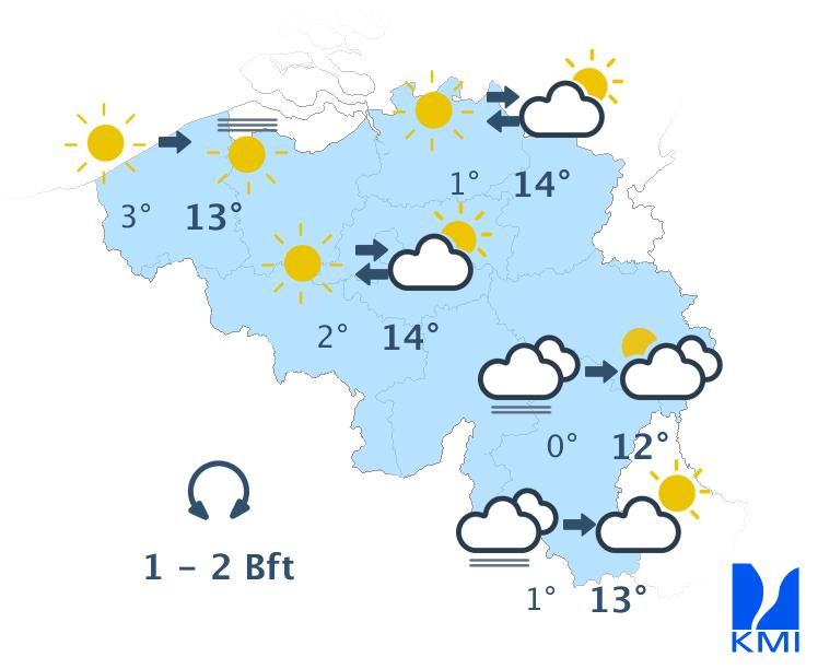 Woensdag blijft het zonnig en zacht met af en toe enkele hoge wolkenvelden. De maxima schommelen rond 17 graden in de meeste streken, met uitschieters tot 20 graden. De wind is matig uit oost tot zuidoost.