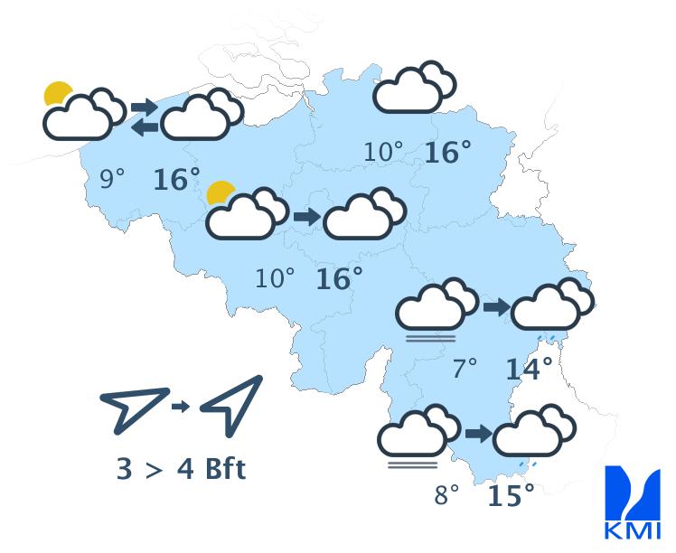 Deze namiddag is het vaak zwaarbewolkt met bij momenten lichte regen of motregen. De maxima liggen tussen 8 graden in de Ardennen en 12 graden in Laag- en Midden-België. De matige en aan zee vrij krachtige wind draait naar zuidwestelijke richtingen.