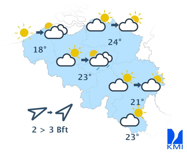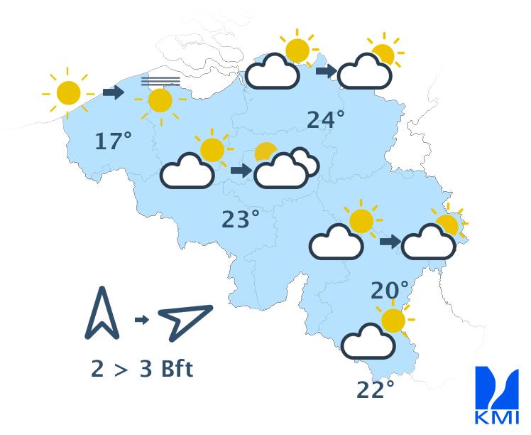 Vandaag start zonnig met enkele hoge wolkenvelden. In de namiddag bollen enkele binnenlandse stapelwolken op vanaf het westen, met tegen de avond kans op een lokale bui, vooral over het oosten. Het wordt wederom warm met maxima tussen 19 graden vlak aan zee en plaatselijk 25 graden in het binnenland. Er staat een zwakke zuidenwind die in de namiddag soms matig wordt en ruimt naar het zuidwesten, aan zee naar het westen.