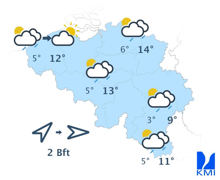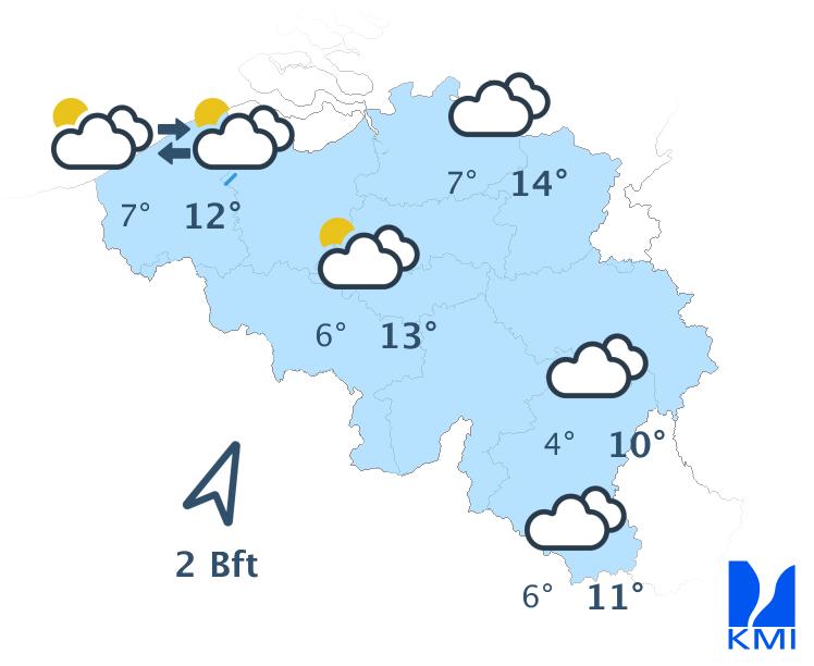 Maandag wordt het iets onstabieler met een wisselende tot soms zwaarbewolkte hemel. Het blijft vaak droog, maar in de loop van de dag ontstaan er enkele verspreide buien. Aan de kust is er beduidend meer zon.De maxima liggen tussen 9 en 14 graden. De wind waait meestal zwak uit west, aan zee matig.