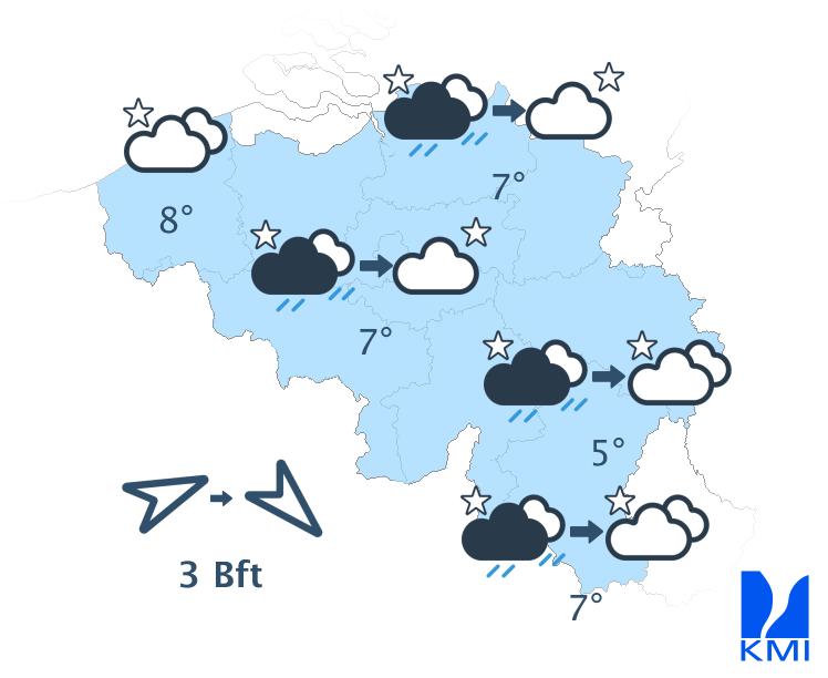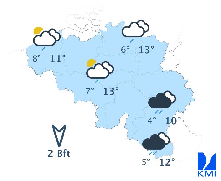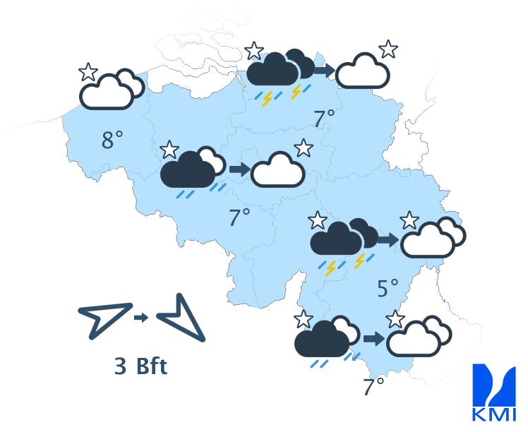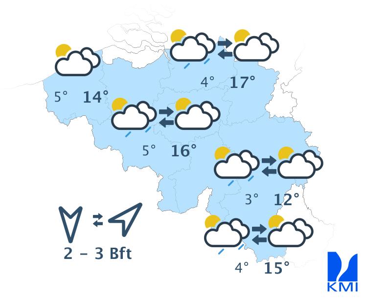 Vanavond en vannacht trekt een koufront voorbij en is er tijdelijk meer bewolking aanwezig met lokaal enkele buien, de meeste in het oostelijke deel van het land. Op deze buien kan lokaal onweer zitten. Vanuit het westen wordt het vrij snel weer droog met opklaringen. De minima dalen naar waarden tussen 3 en 8 graden. De wind wordt stilaan matig en aan zee vrij krachtig uit het noordwesten.