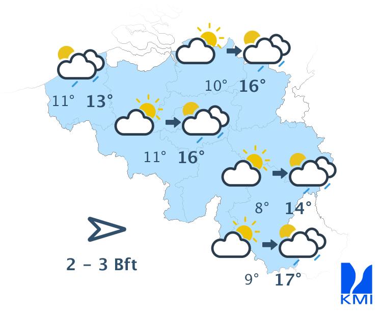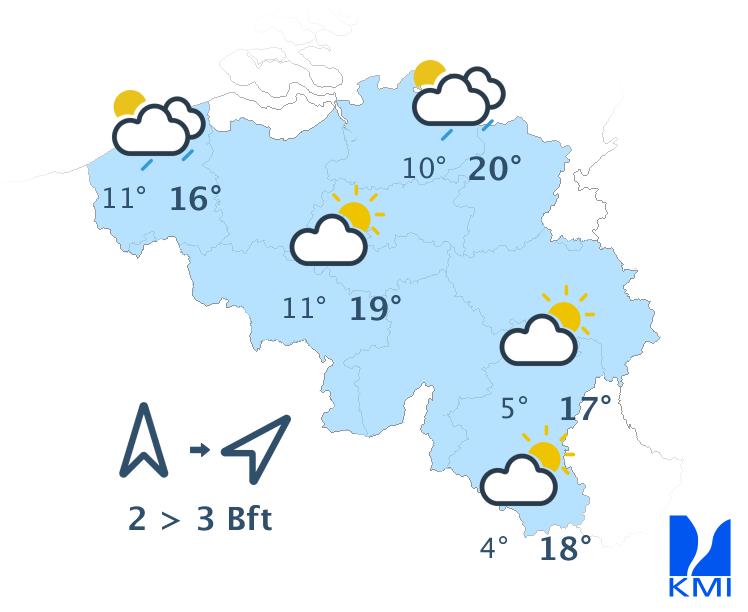 Donderdag wisselen zonnige perioden af met wolkenvelden. Vooral in de zuidelijke helft van het land is er kans op een lokale bui. De maxima liggen tussen 15 graden aan zee en 18 graden in de Kempen. De wind waait eerst zwak en later matig uit het zuidwesten. Aan zee waait de wind matig tot soms vrij krachtig uit zuidwest, ruimend naar west.