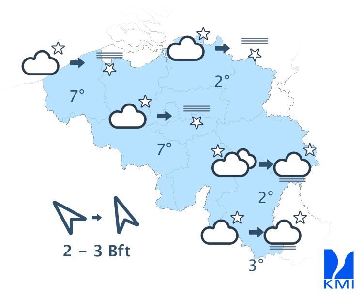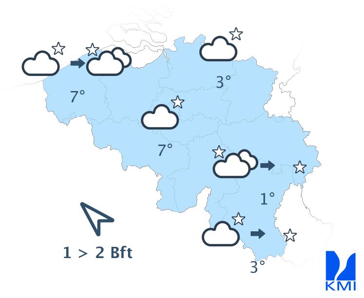 Vannacht blijft het droog en wordt het helder tot licht bewolkt. In de valleien ten zuiden van Samber en Maas zijn mistbanken mogelijk. In de loop van de nacht drijven er meer hoge wolkenvelden over het land vanaf het westen. De minima liggen tussen 0 en 7 graden. In sommige Ardense valleien is lokaal nog lichte vorst mogelijk. De wind waait zwak, plaatselijk matig, uit zuidoostelijke of veranderlijke richtingen.