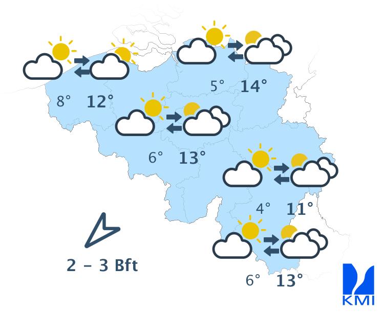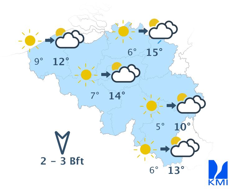 In het begin van de namiddag is het over het westen al bewolkt, maar wordt het elders nog vaak zonnig met wel stapelwolken in de Ardennen. In de loop van de namiddag wordt het langzaamaan ook bewolkt in het centrum, terwijl over het oosten opklaringen en wolken elkaar afwisselen. Op het einde van de namiddag kan er over het westen wat lichte regen vallen. Het wordt vrij warm met maxima van 14 graden in de Hoge Venen, rond 19 à 20 graden in het centrum tot hier en daar 21 graden over het noordoosten. Er waait een matige zuidelijke wind die aan zee soms vrij krachtig kan worden.