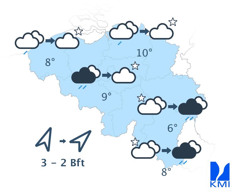 Vanavond verwachten we vaak wolken, maar soms ook lokale opklaringen. Plaatselijk valt er wat lichte regen. Vannacht is het al snel droog over het westen met opklaringen. Elders valt er eerst wat lokale buiige neerslag die op het einde van de nacht het oosten verlaat. Geleidelijk verschijnen er ook in het centrum opklaringen. Zeer plaatselijk is er kans op enkele mistbanken. De minima schommelen tussen 6 en 10 graden. De zwakke tot matige zuidenwind draait naar het zuidwesten.