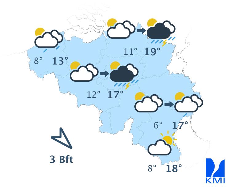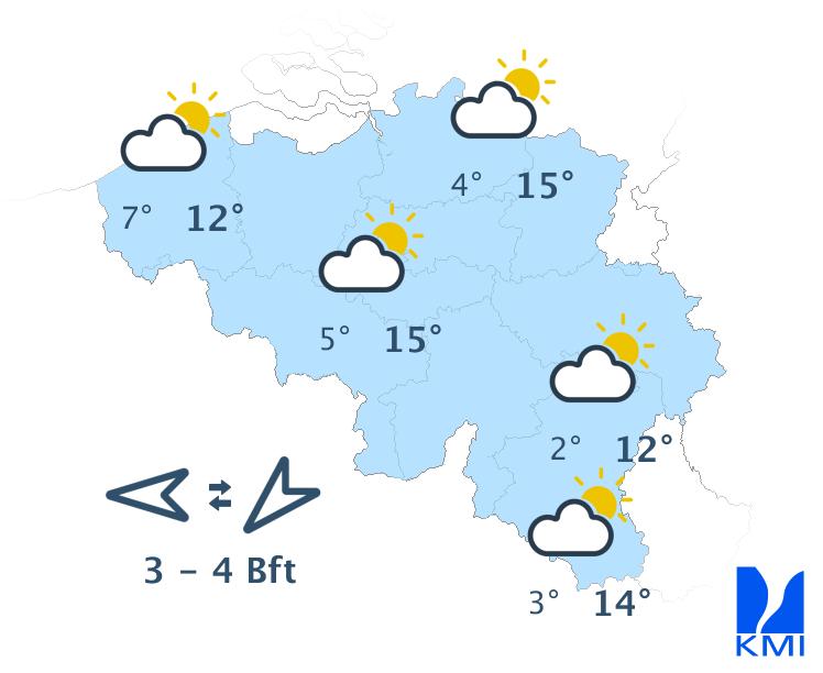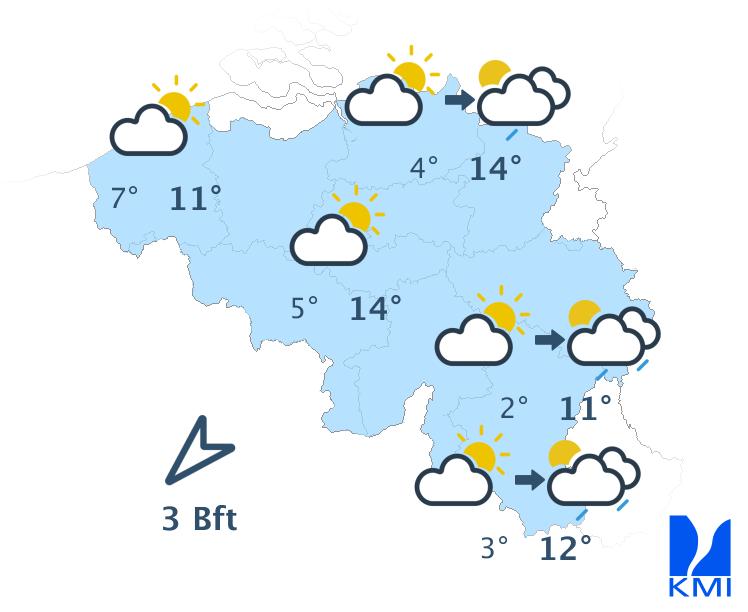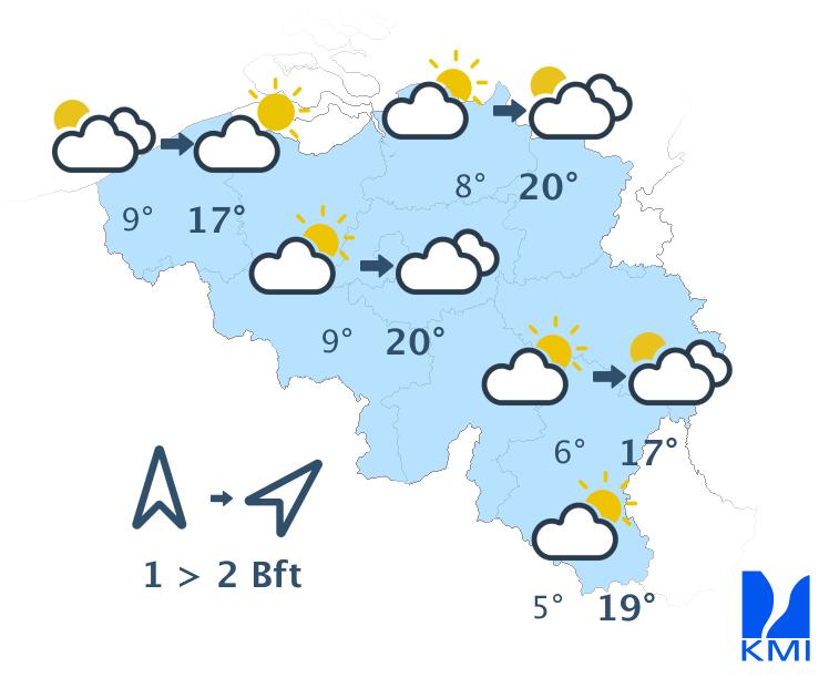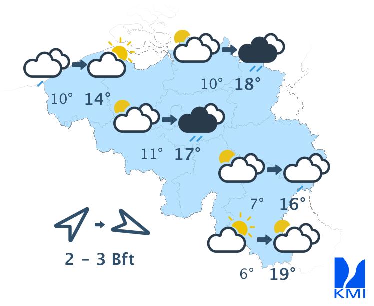 Morgenochtend zijn de opklaringen vaak breed. In de loop van de dag ontstaan er meer wolken en wordt het wisselend tot soms zwaarbewolkt. Hier en daar kan er een buitje vallen, maar het blijft overwegend droog. We halen maxima van 16 of 17 graden in de Ardennen, 19 graden in het centrum tot lokaal 20 graden in Vlaanderen. De zwakke zuidenwind draait naar het zuidwesten en wordt dan matig over het westen.