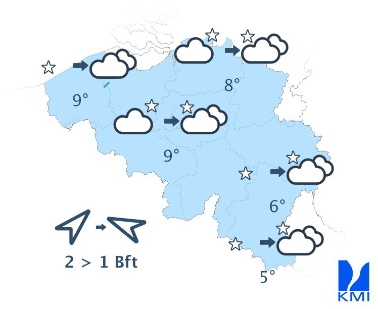 Vanavond valt er eventueel zeer lokaal nog een bui. Vannacht wisselen opklaringen en wolken elkaar af en blijft het droog. Lokaal kan er nevel of mist ontstaan. De minima liggen tussen 3 en 8 graden. De zwakke veranderlijke wind draait stilaan naar het zuiden tot het zuidoosten.
