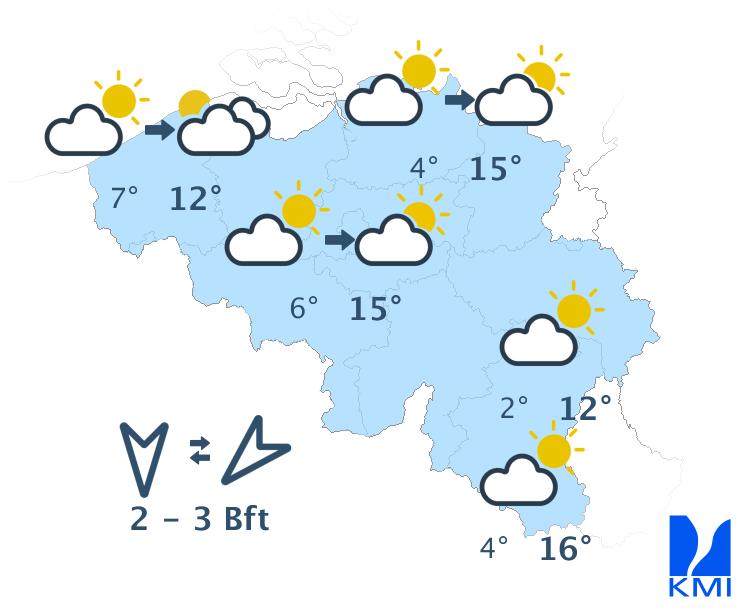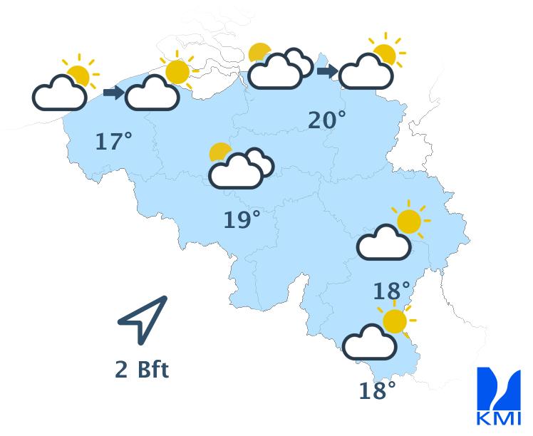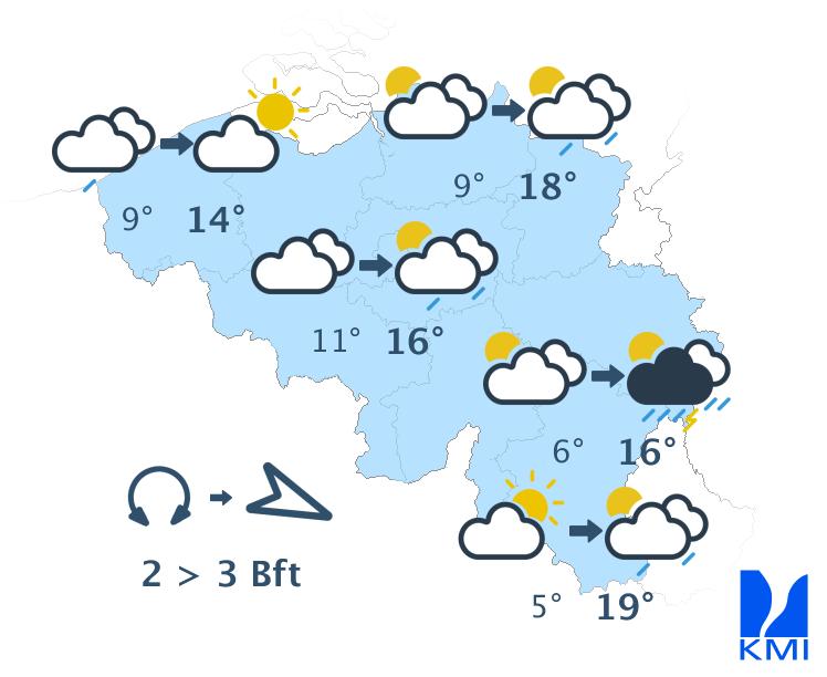 Morgenvroeg zijn er tijdelijk nog brede opklaringen mogelijk in het zuidoosten. Over de rest van het land ligt er een wolkenband die zich oostwaarts verplaatst. In de voormiddag valt er soms wat lichte regen in de westelijke landshelft, nadien in het centrum. In de namiddag bereikt de neerslag ook het oosten, waar het een buiig karakter aanneemt met kans op enkele onweders. Vanaf de zee verschijnen er dan alweer brede opklaringen. De maxima liggen tussen 14 graden aan zee en 19 of 20 graden in Belgisch Lotharingen. De wind waait eerst zwak en nadien zwak tot matig uit het westen tot noordwesten.
