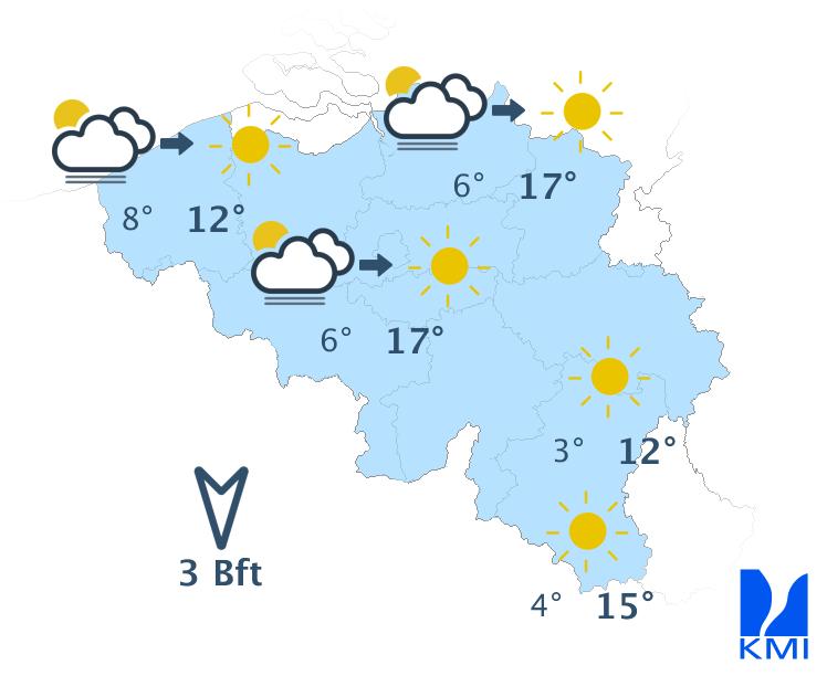 Morgen wordt het zonnig en stijgen de temperaturen tot 13 graden in de Hoge Venen, 15 graden aan zee en 17 à 18 graden in Vlaanderen. De wind waait matig uit oost tot noordoost, en aan de kust uit noordoost.