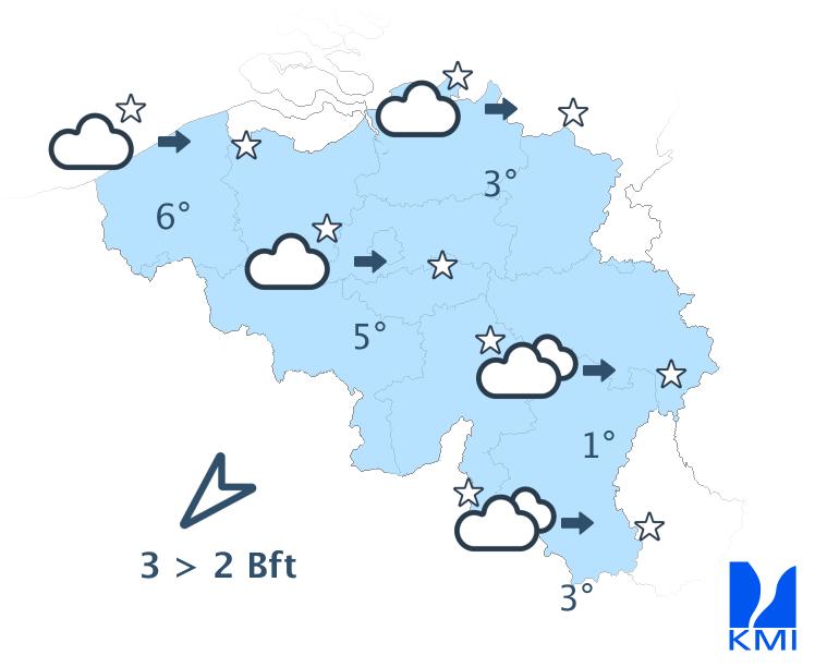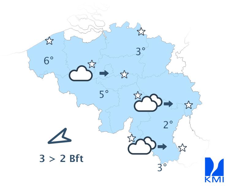 Vannacht verdwijnen de laatste wolkenvelden of trekken ze weg richting Frankrijk. Het klaart overal op. De minima liggen tussen 0 graden op de hoogplateaus van de Oostkantons, 5 graden in het centrum en 6 graden aan zee. De wind waait zwak tot matig uit noordoost.