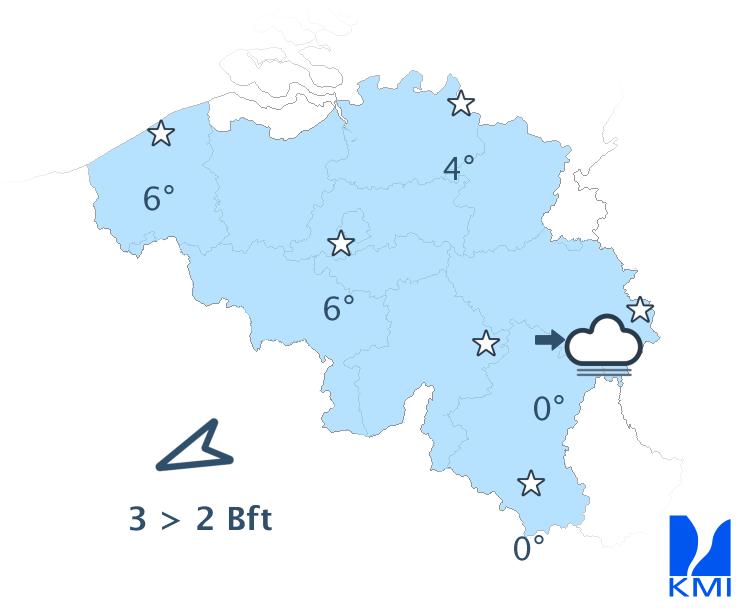 Vanavond en vannacht lossen de laatste wolkenvelden op of verdwijnen richting Frankrijk en klaart het overal op. De minima liggen tussen -1 of 0 graden in de Hoge Venen, 5 graden in het centrum en 6 graden aan zee. De wind waait zwak tot matig uit het oosten tot noordoosten.