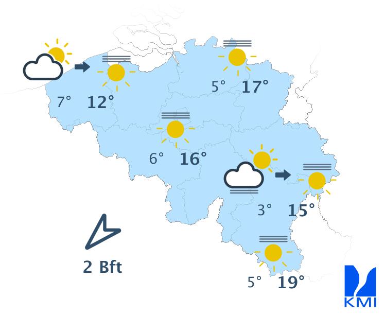 Ook in de nacht naar vrijdag wordt het vrij koud. Na het verdwijnen van lokaal nevel of mist in de ochtend wordt het overal zonnig met maxima tussen 14 en 17 graden in de Ardennen en 17 tot 19 graden in de andere streken van het binnenland. In een kuststrook liggen de maxima tussen 12 en 15 graden. De wind waait zwak tot matig uit het noorden tot noordoosten.