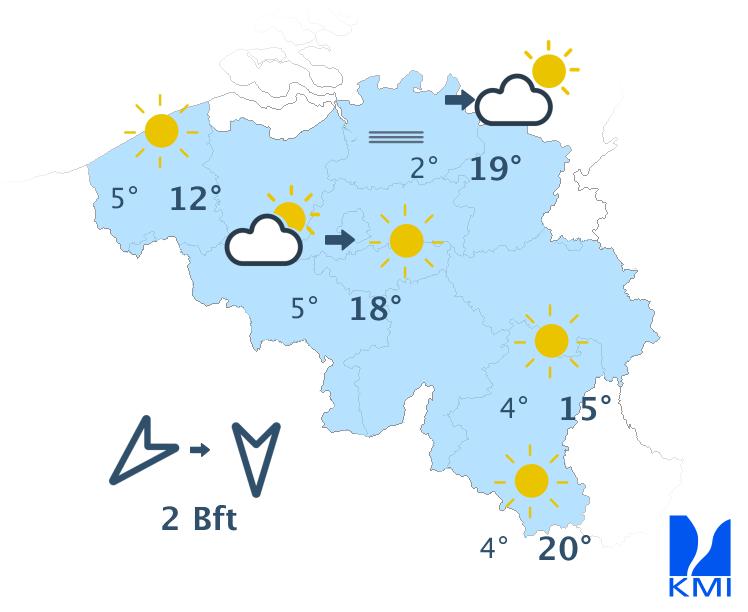 Woensdag is het zonnig met maxima van 12 of 13 graden in de Hoge Venen tot lokaal 18 graden in Vlaanderen. De oosten- tot noordoostenwind neemt snel toe tot matig in het binnenland en matig tot soms vrij krachtig aan zee.