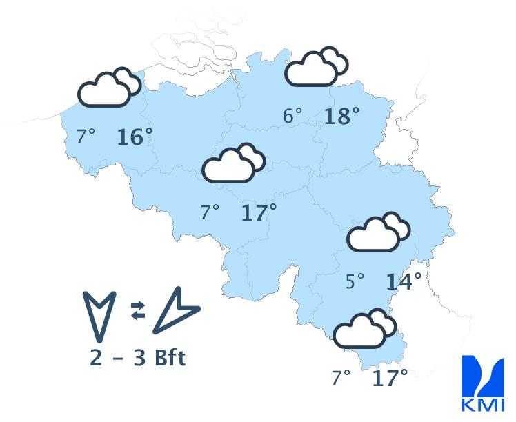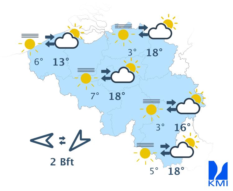 Morgenochtend hangt er op sommige plaatsen nog mist, maar later wordt het overal overwegend zonnig. De maxima liggen rond 12 à 13 graden aan de kust, rond 14 graden in de Hoge Venen en tussen 18 en 20 graden in binnenland. De wind waait eerst zwak en later zwak tot matig uit noord tot noordnoordoost.