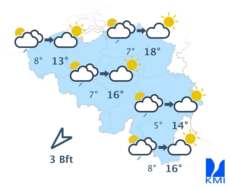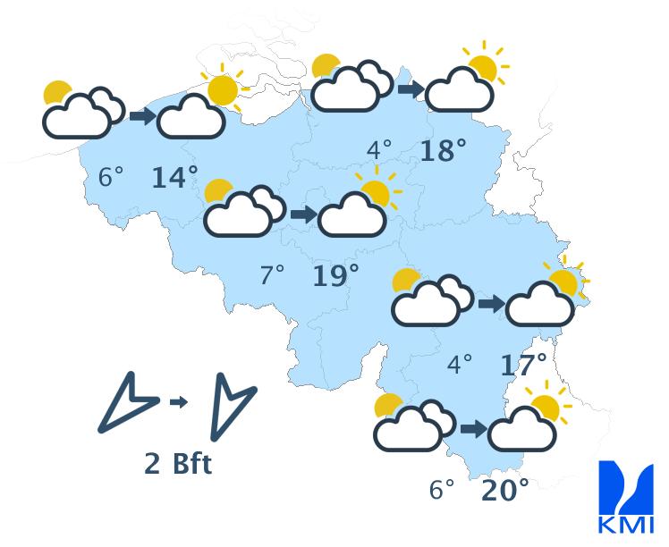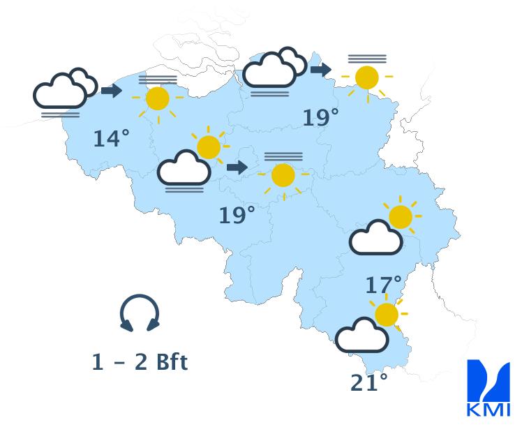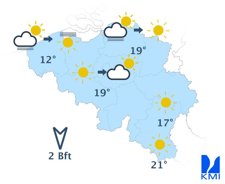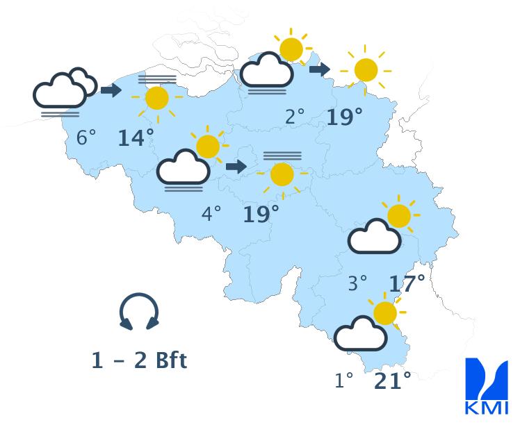 Vanochtend hangt er lokaal mist of lage bewolking, vooral dan over de noordelijke landshelft. Daarna wordt het snel overal opnieuw zonnig. De maxima schommelen rond 12 à 13 graden aan de kust, rond 14 graden in de Hoge Venen en tussen 18 en 20 graden in Laag- en Midden-België. De wind waait eerst zwak en later soms matig uit noord tot noordnoordoost.