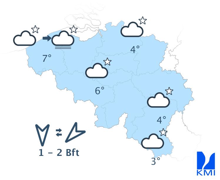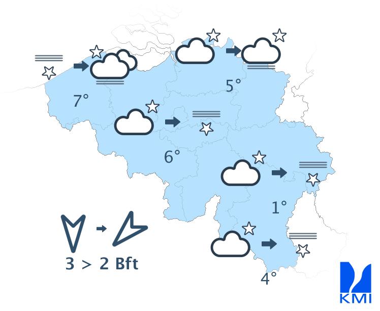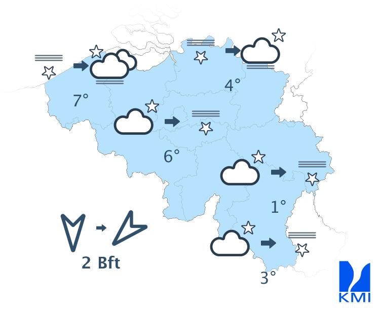 Vanavond is het helder tot lichtbewolkt. In de loop van de nacht ontstaan er mistbanken of lage wolken, vooral dan over de noordelijke landshelft en in de Ardennen. De minima liggen tussen 0 en 6 graden. In sommige Ardense valleien daalt het kwik tot -3 of -4 graden. De wind waait eerst zwak tot matig uit noord tot noordoost en later zwak uit noordoost tot oost of uit veranderlijke richtingen.