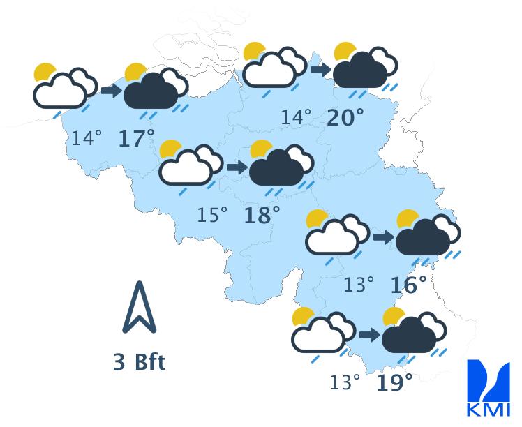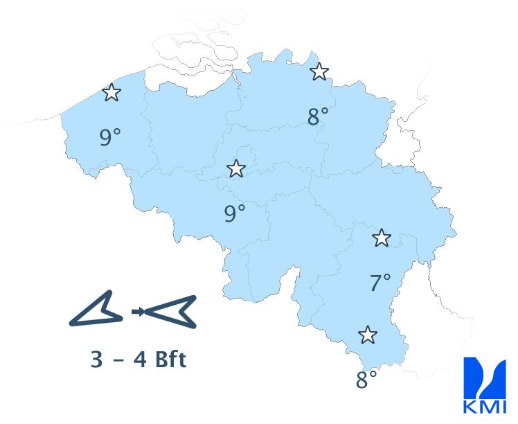 Deze ochtend is het gedeeltelijk bewolkt. De opklaringen worden geleidelijk aan breder en in de loop van de namiddag wordt het uiteindelijk zonnig. Het wordt vrij warm met maxima tussen 15 graden aan zee en 22 graden in Belgisch Lotharingen. De wind is goed voelbaar. Er staat een matige of aan zee vrij krachtige wind uit het oosten tot noordoosten, met rukwinden tot 50 km/u of aan zee wat meer.