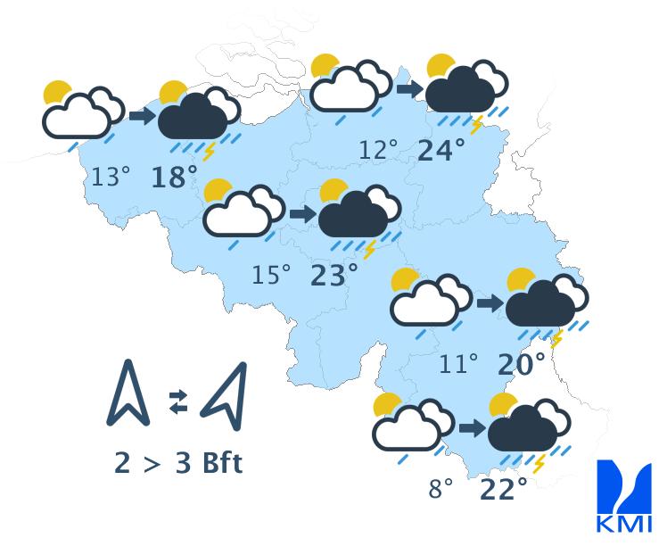 Zaterdag is het wisselvallig met enkele buien (eventueel met onweer) en tussendoor opklaringen. Het wordt nog warm met maxima tussen 19 en 23 graden. De wind waait matig en draait naar het zuidwesten.